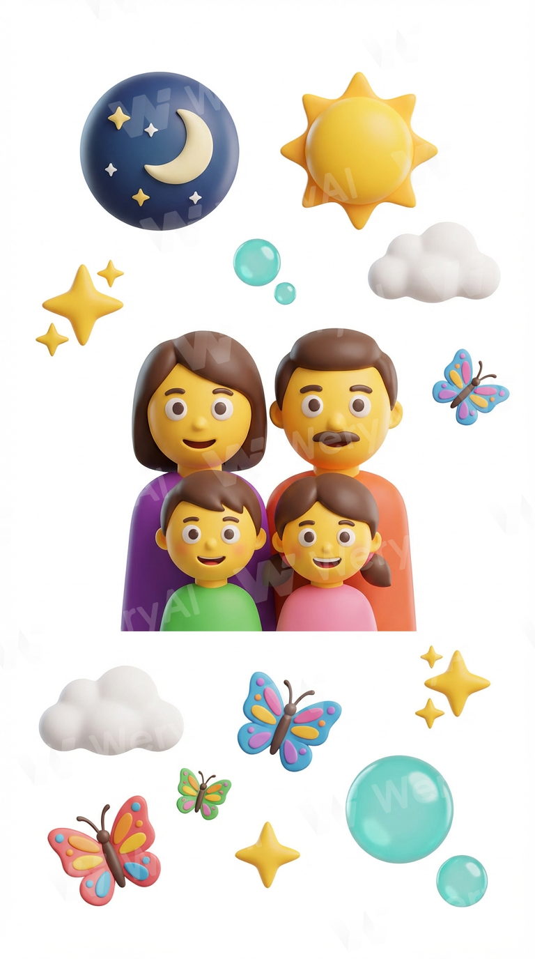 Based on the visual style of the reference image, generate for me: a mother and father with their son and daughter standing in front of them, night, sun, four-pointed stars, clouds, butterflies, and bubbles. All of these emojis should be in one image on a pure white background.