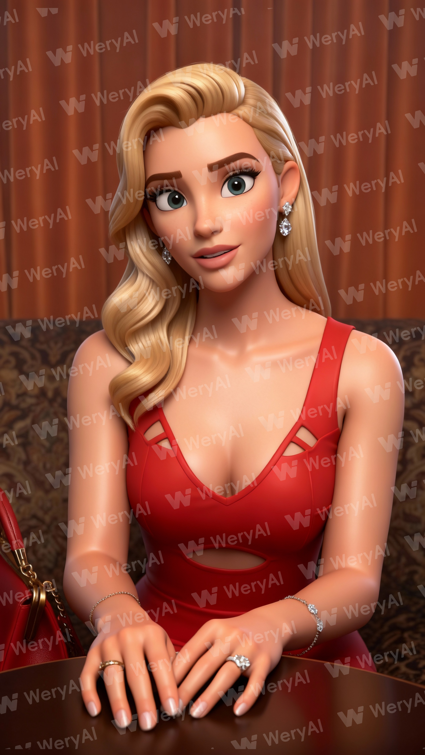 photorealistic, close-up shot, Aurora, action, wearing a red dress, sitting at a table, masterpiece, best quality, ultra-detailed, correct anatomy, proper body proportions, perfect hands, no extra hands, no bad anatomy, no misplaced nipples, no extra nipples