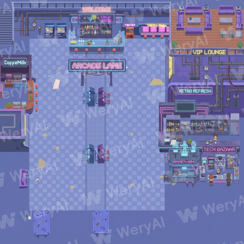 Add some objects, pipes, neon signs, stalls, and a second-floor lounge, while keeping the perspective unchanged.