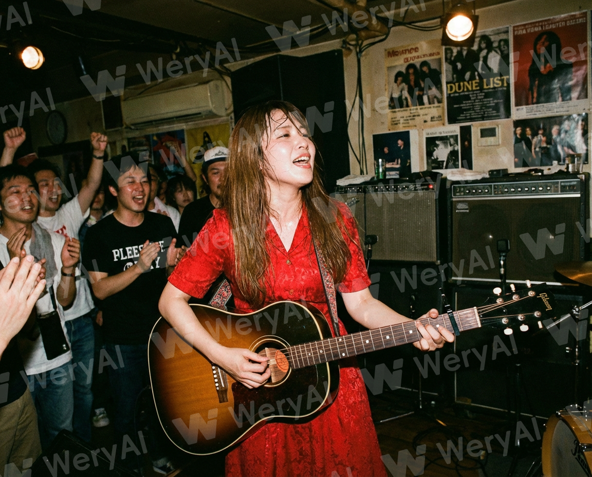 A long-haired Japanese woman in a red dress singing with a Gibson acoustic guitar at a live music club.