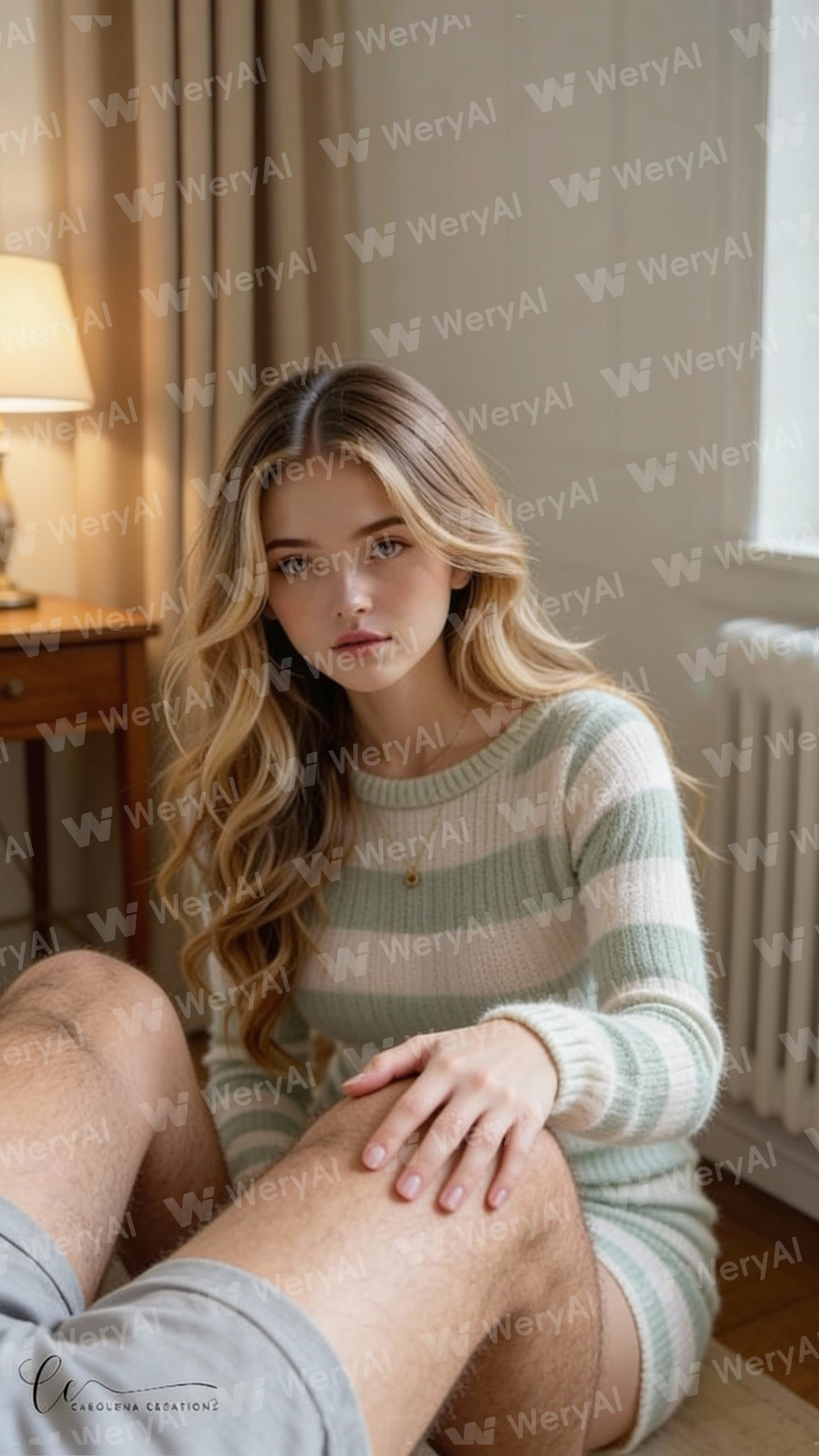 Have the girl in Figure 1 caress the pair of legs in Figure 2, placing one hand on one of the thighs.