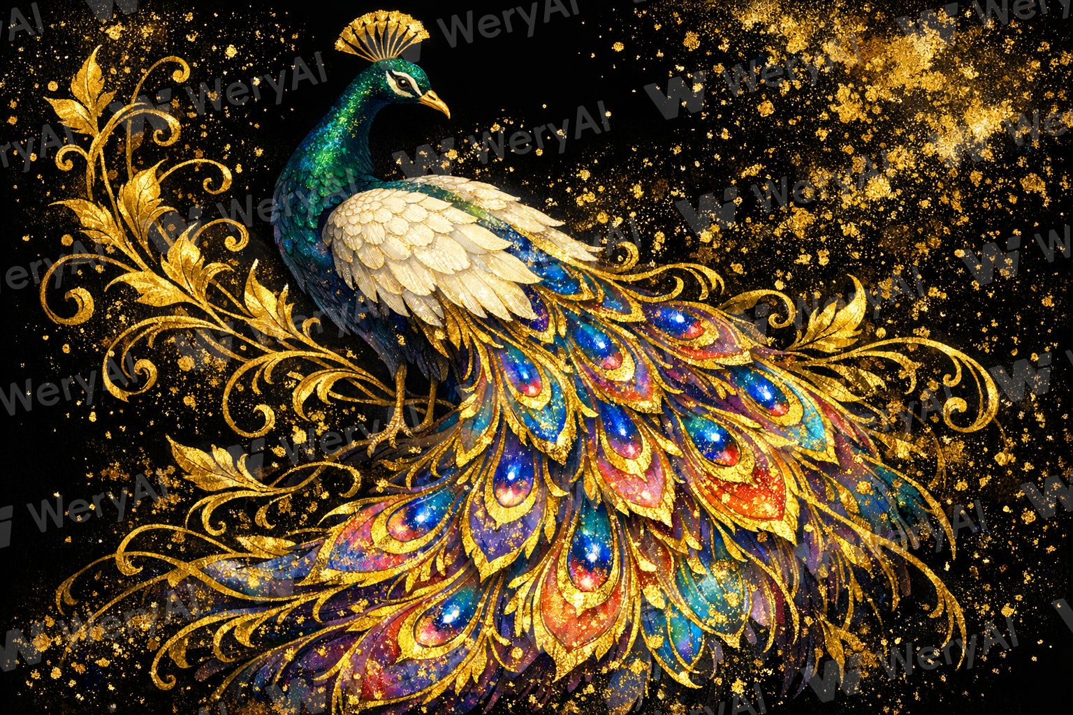 New Chinese-style light luxury mineral pigment illustration, featuring an auspicious peacock in a graceful pose as the main subject. Its head and neck are a deep, dark green with a metallic luster, while the crest feathers are exquisite golden fan shapes. The wings are covered with warm, milky-white feathers. The tail feathers are extremely ornate and intricate, outlined and grounded with pure gold leaf, featuring a dreamlike gradient of blue, purple, pink, cyan, and gold within. It possesses a transparent glaze-like luster and fine gold leaf particles. Surrounding the peacock are curling, flowing golden vines and foliage decorations. The background is an absolute pure black, scattered with golden stardust and gold leaf splash-ink effects. The overall atmosphere is luxurious and mysterious, dazzling and brilliant, with rich colors and deep layers. The brushwork is delicate, blending the precision of fine-brush painting with the heavy texture of mineral pigments, presenting a sense of Oriental auspiciousness and a strong visual impact.