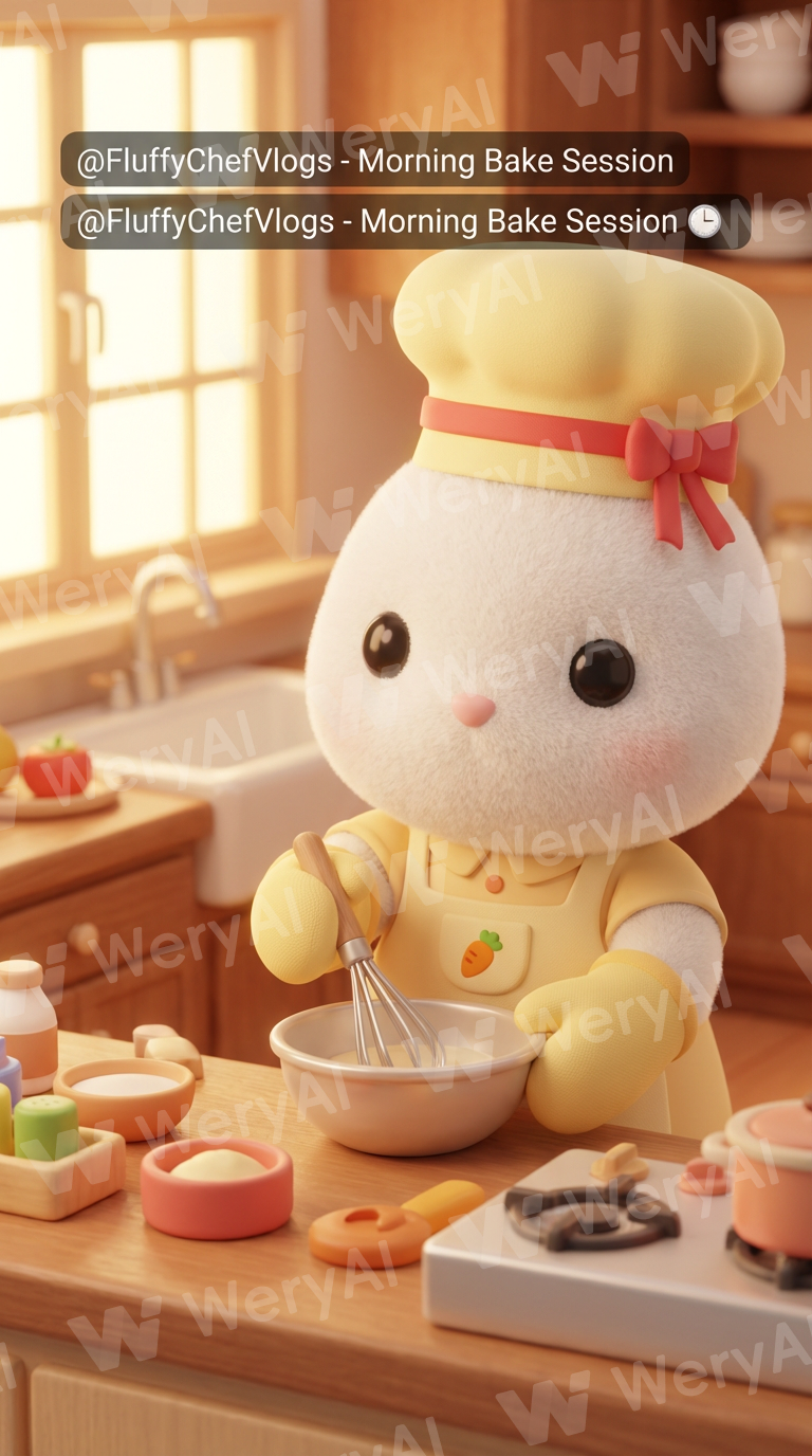 A cute white rabbit character in a 3D Blender style daily cooking vlog. The rabbit has soft fluffy white fur, big round black eyes, and a small pink nose. The rabbit is wearing a pastel yellow chef hat with a small red ribbon, and a pastel yellow apron with a tiny carrot logo on the pocket. Matching yellow oven mitts. The rabbit is standing in a cozy kitchen, facing the camera. No dialogue, vlog-style. Gentle hand movements as if cooking, subtle body motion and breathing. Warm, soft cinematic lighting. Wholesome, cozy, child-friendly mood. Camera slowly zooms in from the front. Vertical 9:16 format. High quality 3D render. Video length: 6–8 seconds.
