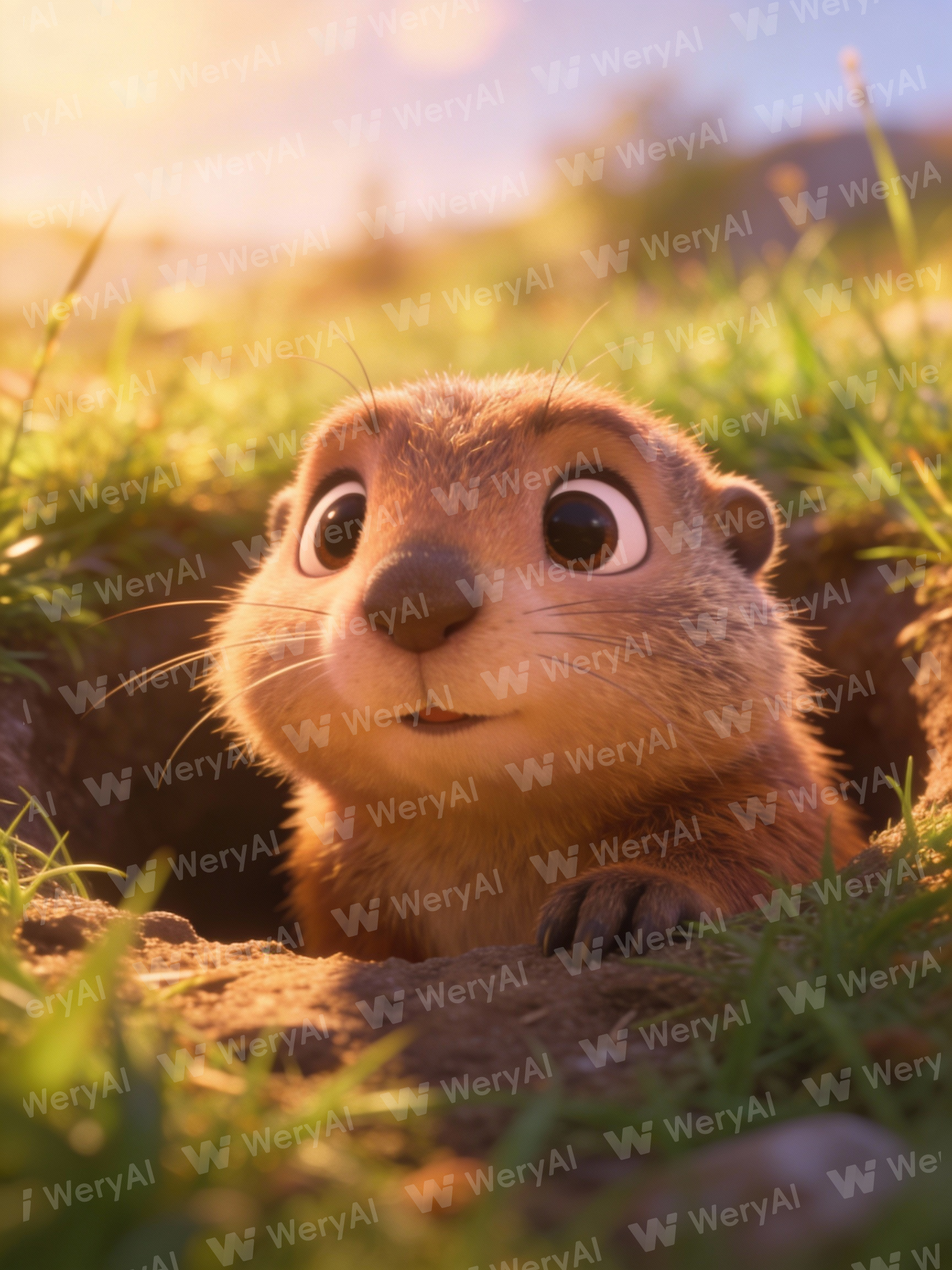 Cinematic shot, close-up: an adorable anthropomorphic groundhog emerges halfway out of a grassy burrow, its eyes full of innocence and curiosity. Dramatic lighting and shadows, soft afternoon sunlight, blurred background, ultra-fine details, 8K resolution.