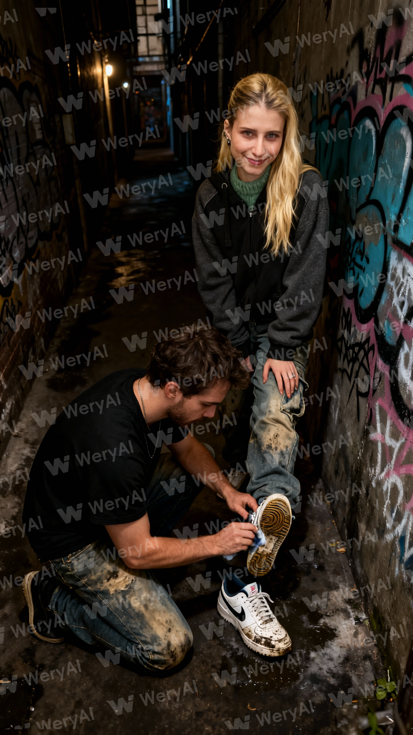 photorealistic, a blonde woman with a knowing smirk, a man on his knees, high angle shot, cleaning the sole of a dirty Air Force One sneaker, worn jeans, black t-shirt, dimly lit alleyway, graffiti on the walls, cinematic quality, ultra-detailed, masterpiece, best quality
