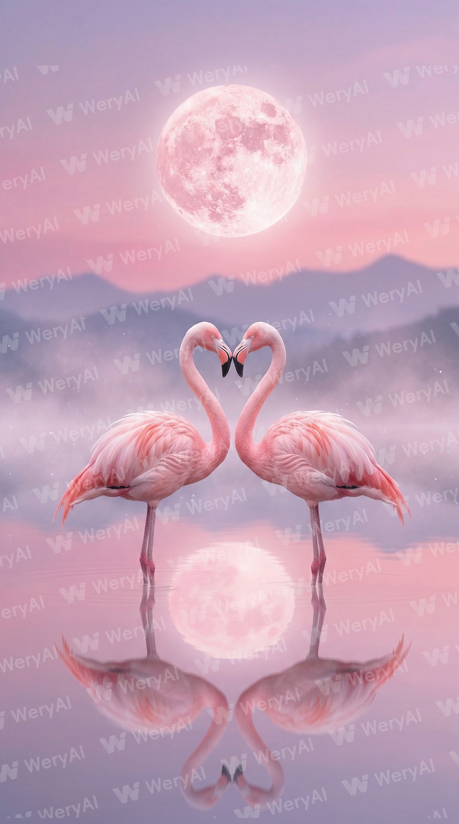 Two elegant pink flamingos standing in shallow reflective water, facing each other with curved necks forming a heart shape, soft pastel pink color palette, dreamy surreal atmosphere, large glowing pink full moon in the sky, minimal landscape with distant hazy mountains, smooth water reflections, ultra-detailed feathers, soft cinematic lighting, romantic mood, fantasy realism, high resolution, vertical composition, aesthetic wallpaper style, calm and serene scene