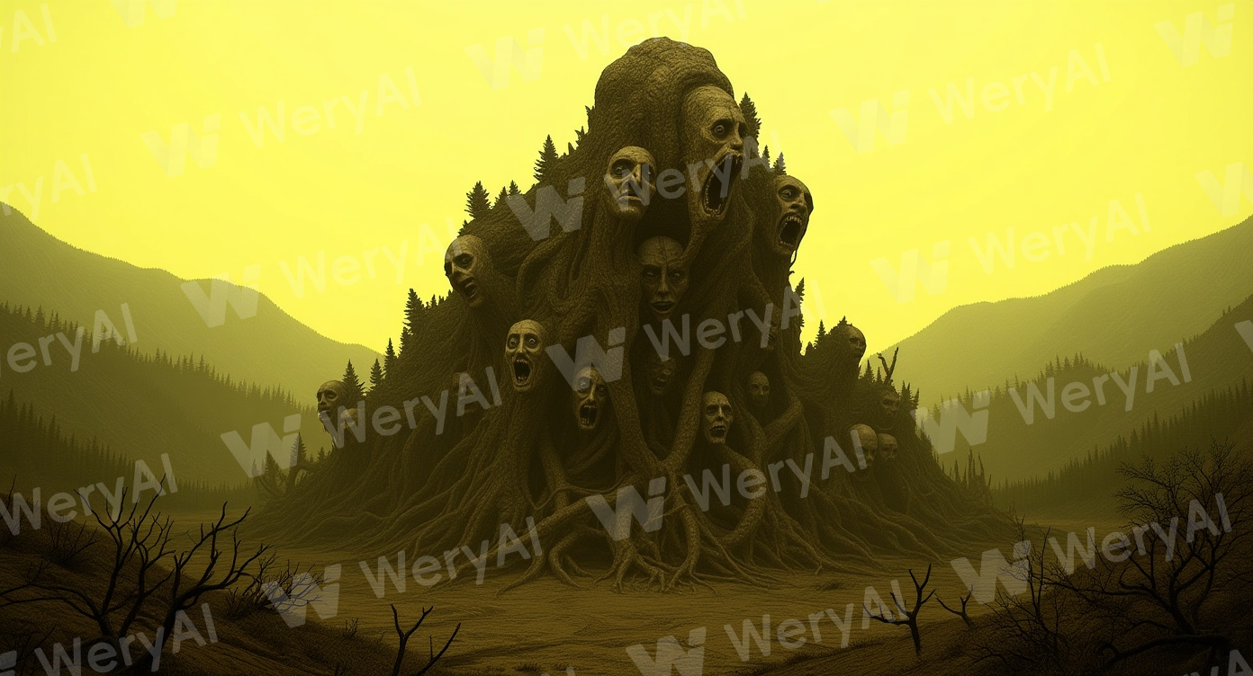 A vast natural landscape in daylight, somewhere remote on Earth, mountains and dead forests under a sickly yellow sky. In the middle of the scene stands something that should not exist: a colossal, malformed entity fused with the land itself. Its body looks like a broken imitation of nature — twisted stone, rotting flesh, exposed bone structures growing like trees, veins spreading through the ground like roots. Faces are embedded everywhere in its surface, frozen in silent screams, eyes open, staring in all directions. The scale is overwhelming, making humans look like insects. The atmosphere causes instinctive panic and dread, uncanny and wrong, as if reality is collapsing. No symmetry, no recognizable biology, pure existential horror. Ultra-realistic, hyper-detailed textures, cinematic lighting, oppressive mood, photorealism, 4K resolution, sharp focus, extreme detail, nightmare fuel, cosmic horror, disturbing, terrifying, unsettling.