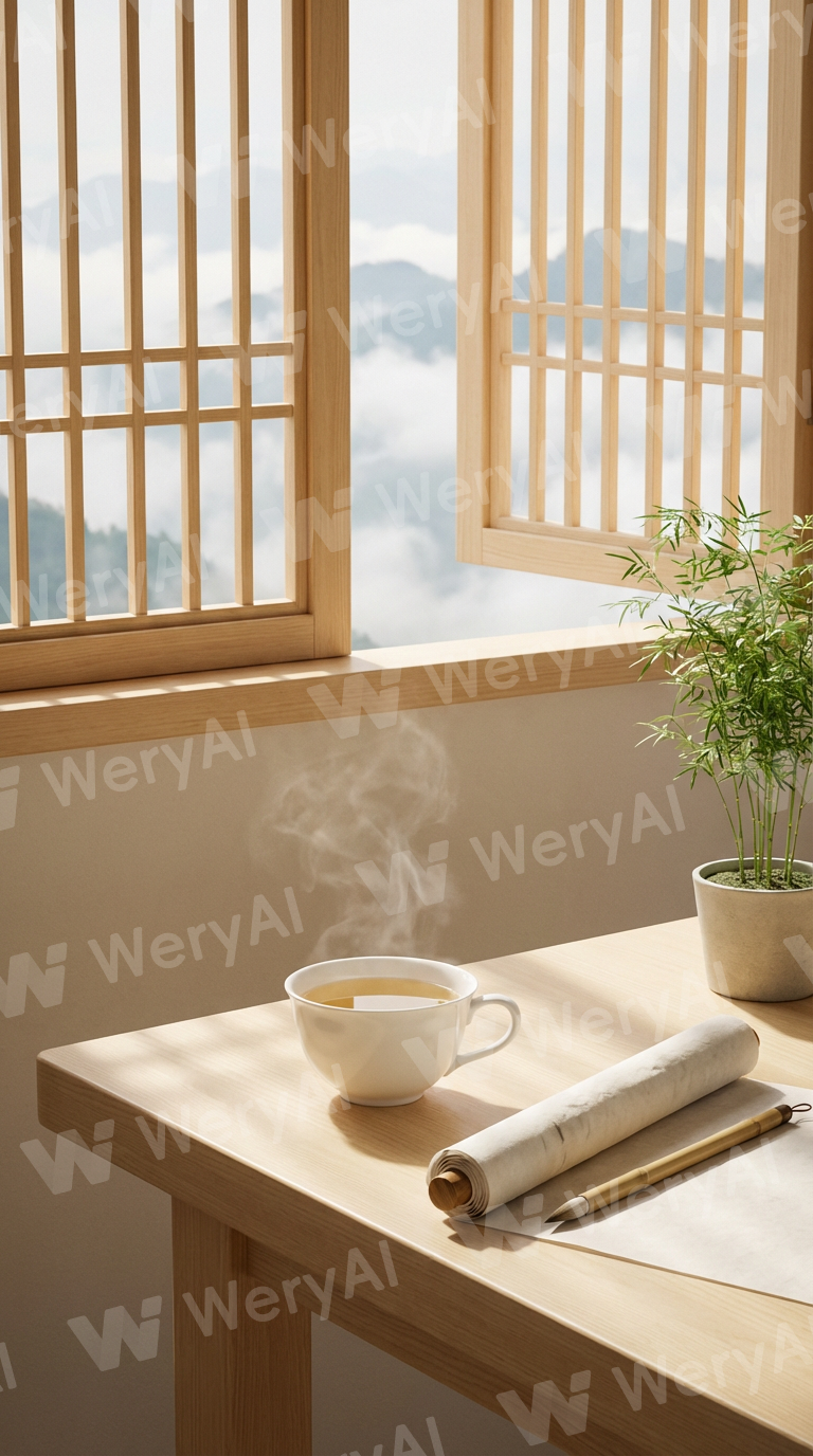 A corner of a minimalist raw wood tea table. A white porcelain teacup holds half a cup of clear tea, with faint steam rising from the rim. Beside it lies an unrolled scroll of Xuan paper and a bamboo calligraphy brush. A small potted asparagus fern sits by the tea table, its branches and leaves stretched out in emerald green. The background features a half-open wooden lattice window, with misty distant mountains and leisurely white clouds outside. Sunlight filters through the window frame, casting soft spots of light. The tabletop is clean and tidy with ample negative space. The overall color tone is warm and elegant, and the atmosphere is quiet and relaxed. No people present. Suitable as a daily quote wallpaper, featuring high definition and balanced composition.