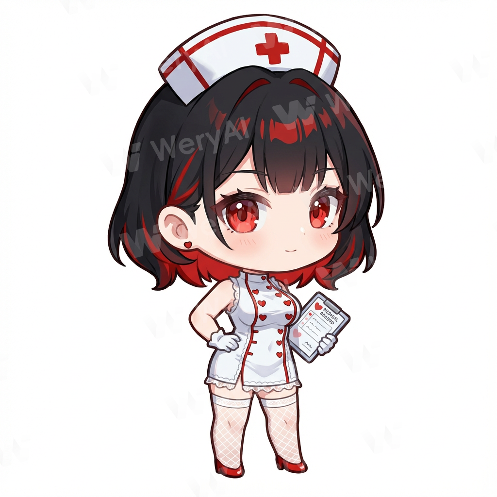 Draw the character from Image 1 in a chibi style. The character should be facing right in a normal standing pose, with a 1-head scale proportion. Refer to the second and third images for the art style, which should be a Japanese anime chibi style. White background.