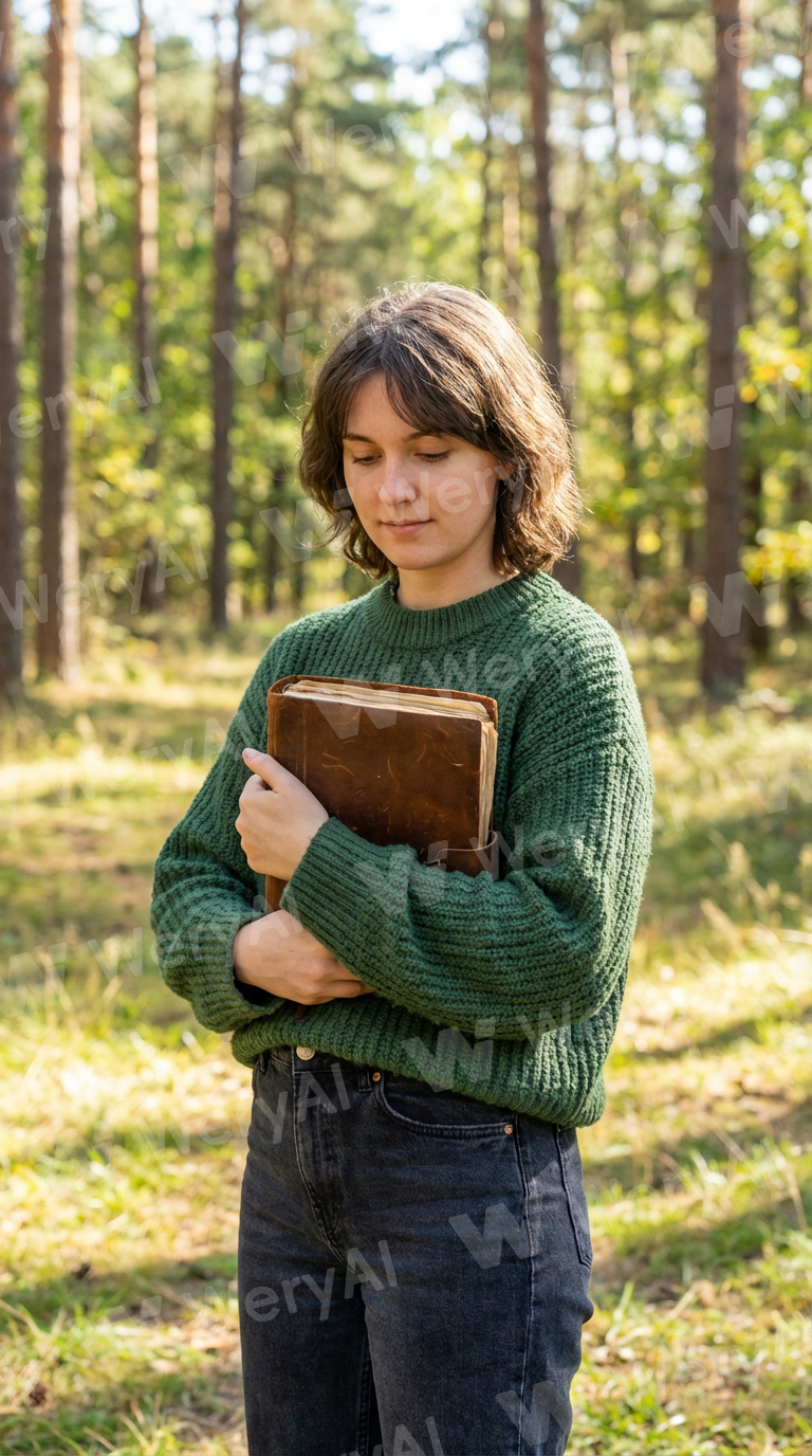 In the first image you generated, keep the person's size and the background the same, but change the book they are holding and the clothes they are wearing.