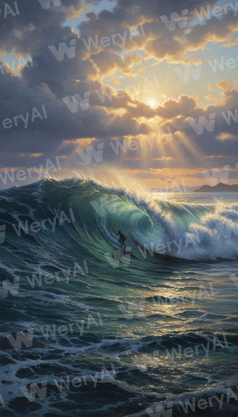 Hudson River School painting aesthetic, lone surfer riding massive wave at golden hour, sublime nature overwhelming human scale, dramatic cloud formations with god rays breaking through, luminous atmospheric perspective, Thomas Cole and Frederic Church inspiration, romantic wilderness grandeur applied to ocean, wave rendered with obsessive water detail and translucency, foam patterns like lace against deep blue-green depths, tiny human figure emphasizing nature's immensity, warm amber light on wave crest contrasting cool shadows in barrel, traditional oil painting texture with glazing technique, 19th century American landscape tradition, spiritual reverence for natural power, horizon line low emphasizing sky drama, birds distant in formation, authentic wave physics with spray and mist, desaturated palette avoiding artificial vibrancy