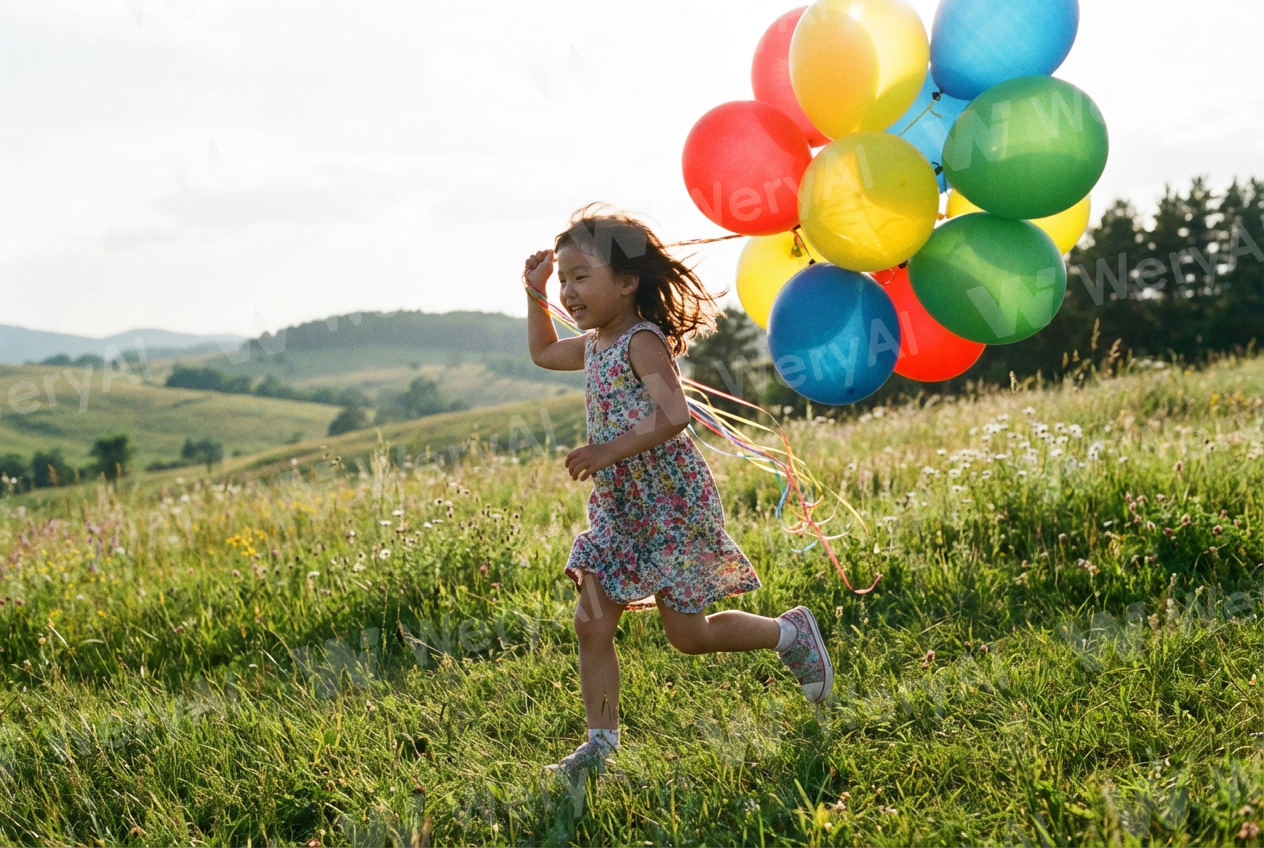 An Asian girl running on the lawn holding a balloon