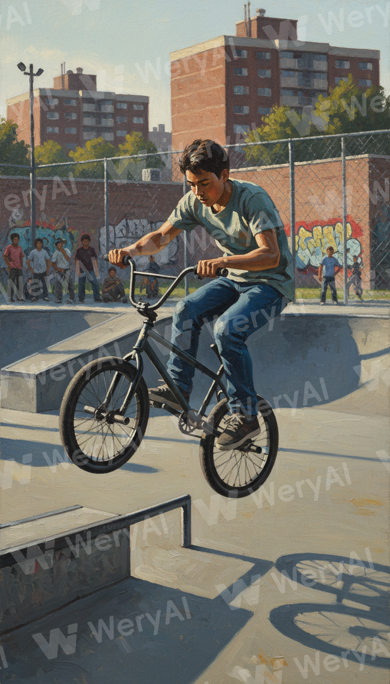 Social Realism art style, BMX rider performing tailwhip at urban skatepark, working-class neighborhood visible in background, honest unflinching portrayal of youth culture, Ben Shahn and Diego Rivera influence, strong simplified forms with dignity, muted industrial palette of concrete grey chain-link silver and faded denim blue, late afternoon side lighting creating long shadows, other riders and spectators in background adding community context, worn equipment showing authentic use, graffiti murals providing color accents, documentary quality avoiding glamorization, celebration of skill and dedication in overlooked communities, thick impasto brushwork on figure, flatter treatment of background, psychological presence in facial concentration, sweat and effort visible, public housing towers in distance, authentic representation of contemporary urban youth