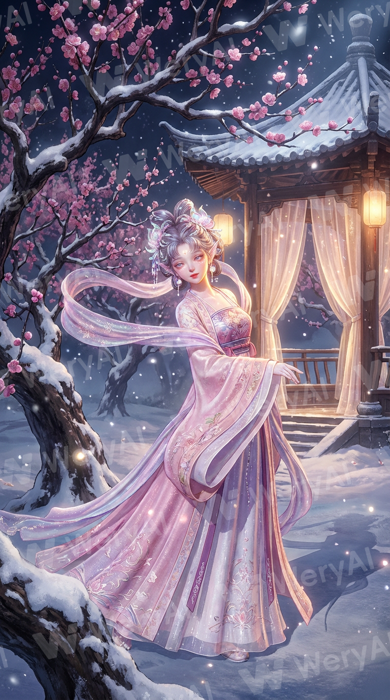 Hairstyle reference image two. Transform the face of the person in image one into an exquisitely beautiful fairy. Character Diao Chan: a stunningly beautiful dancer, wearing a gorgeous pink, purple, and white traditional Chinese Hanfu (no fur collar, not too thick), with exquisite, pearlescent, aesthetically pleasing, romantic hair accessories. Dancing gracefully under a plum blossom tree in the snow (legs not exposed). The background is an ancient architectural pavilion with sheer curtains, thick snow on the tree trunks, several large pink plum blossom trees blooming proudly at the pavilion entrance, snowflakes falling from the night sky, lanterns. Thigh-up composition, style consistent, illustration, 2D anime realistic style, exquisite heavy painting, 3D realistic character heavy painting, BJD, Octane Render, Unreal Engine render, illustration semi-heavy painting, 3D character rendering, dreamy, mysterious, ethereal, sophisticated, atmospheric, hazy, enchanting, oil painting texture, bewitching, alluring, sexy, seductive, serene, languid, fine and rich brushstrokes, smooth and natural lines, strong light and shadow contrast, master-level lighting, harmonious colors, delicate rendering, rich details, fine and distinct hair strands, clear and translucent skin, character glow, matte texture, motion capture, painterly brushwork, intricate interplay of light and shadow, strong light and shadow contrast, shimmering light and shadow, glowing particles, ultra-fine brushstrokes, ethereal feel, hand-painted texture, natural lighting, faint night glow, elegant demeanor, anime aesthetic, anime, CG, ultra HD, ultra high quality, macro lens, facial focus, AI art, exquisite output, master composition, master-level work, perfect quality, diffuse particles, high-end feel, soft focus, outstanding, face illuminated by light with a warm sensation, ultimate ultra-clear, ultimate detail, dreamy