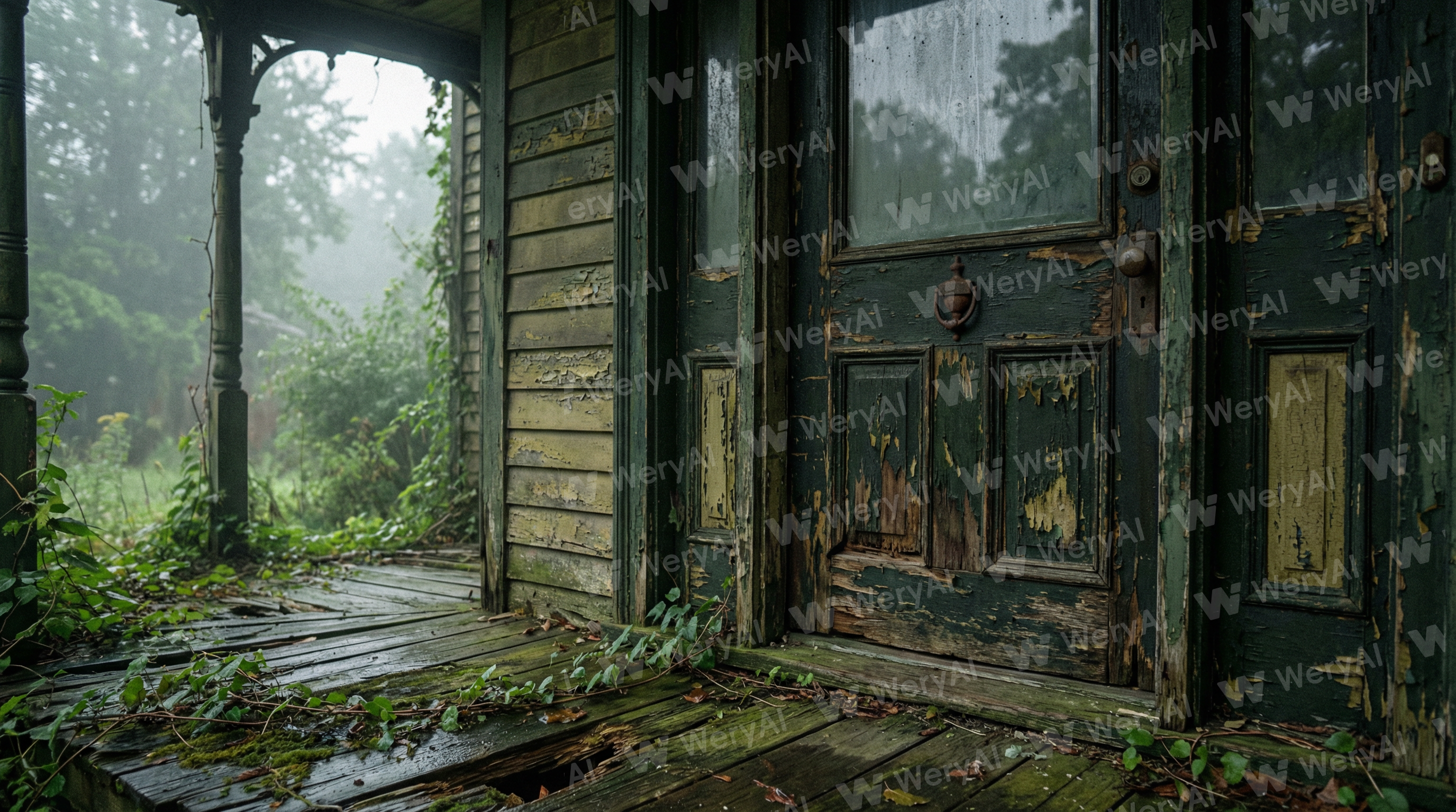 Create an ultra-realistic cinematic photo of the front door of a decrepit old Victorian-style house, weathered wood, peeling paint, sagging porch. The atmosphere feels quiet, humid, and slightly eerie. Camera is stationary looking directly at the door with natural depth of field, realistic lighting and cinematic realism.