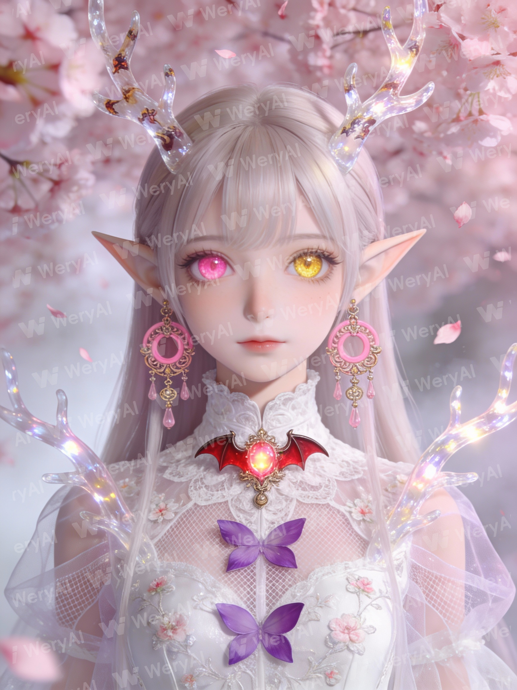 Subject: Ethereal elf maiden with striking heterochromia eyes in pink and golden-yellow, long pointed ears, crystalline deer antlers with organic mottling, and a serene doll-like expression with soft porcelain skin. Clothing: Intricate high-collared white lace bodice featuring delicate floral micro-embroidery, translucent layers of fine mesh fabric, and decorative purple butterfly petal motifs on the chest. Decoration: Elaborate ornate pink circular earrings with dangling baroque ornaments, a glowing crimson bat-shaped gemstone brooch at the throat, and shimmering translucent antlers reflecting soft ambient light. Background: Surrounded by a dense canopy of pink cherry blossoms, hazy sakura petals floating in a misty ethereal atmosphere, with a shallow depth of field creating dreamlike spatial depth. Copy: None. Style: High-key pastel aesthetic, ethereal anime digital illustration, subsurface scattering for skin luminosity, soft-focus 85mm lens compression, delicate line art, diffuse bounce lighting, and cinematic high-fidelity rendering.
