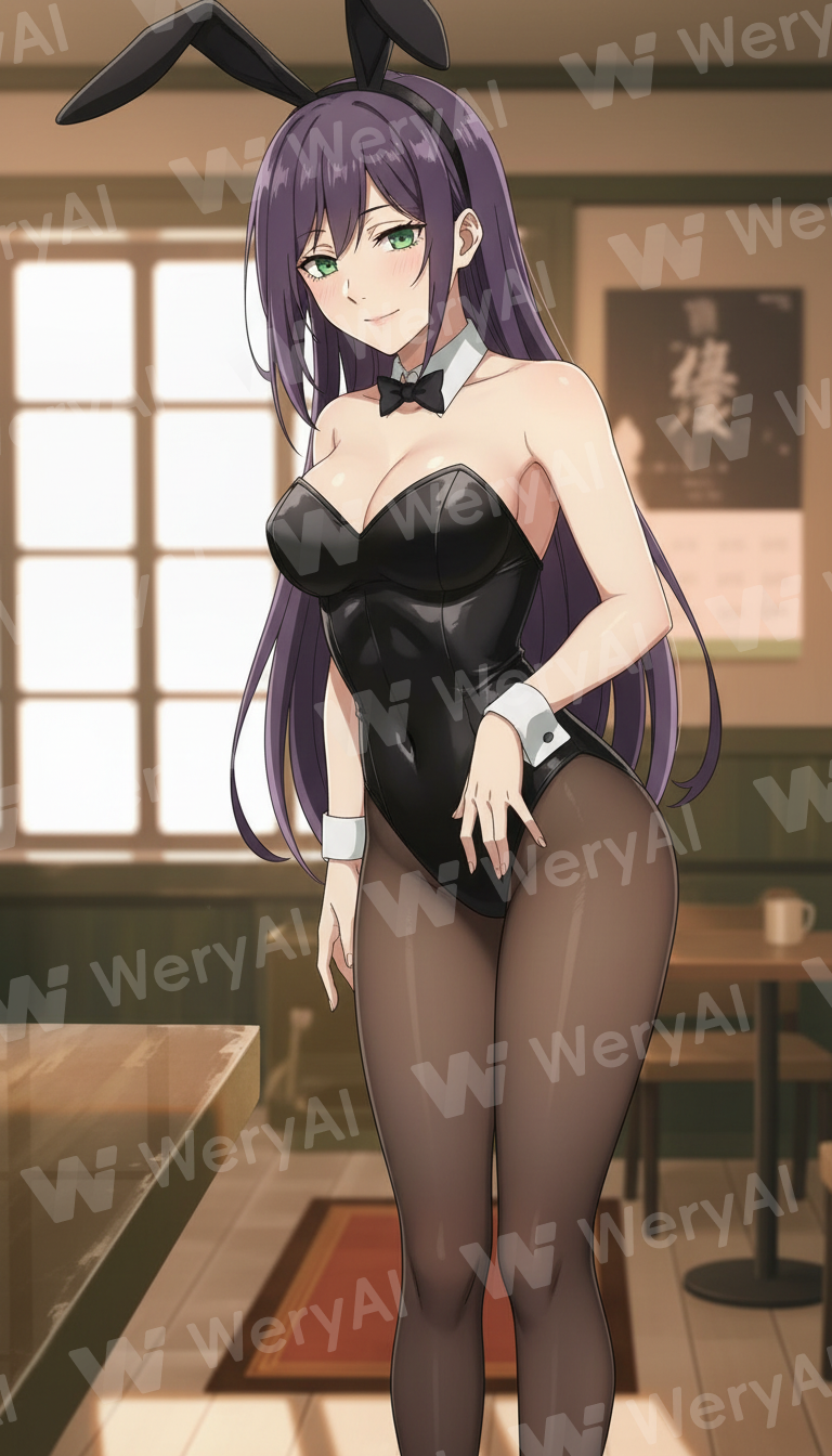 Anime-style illustration of Reze from Chainsaw Man wearing a glossy black bunny suit with a strapless design, sheer tights, and matching bunny ears. She has long dark hair styled neatly, striking eyes, and a confident yet playful expression. Her pose is elegant and slightly flirtatious, emphasizing a slim, curvy figure. Warm sunlight streams through large windows in a cozy modern room, creating soft highlights and realistic shadows. High detail, polished anime rendering, smooth skin shading, vibrant colors, and professional character illustration quality.