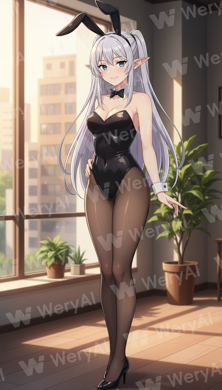 Anime-style illustration of Frieren from 'Frieren: Beyond Journey’s End' wearing a glossy black bunny suit with a strapless design, sheer tights, and matching bunny ears. She has long silver hair tied into twin ponytails, deep blue eyes, and a confident yet playful expression. Her pose is elegant and slightly flirtatious, emphasizing a slim, curvy figure. Warm sunlight streams through large windows in a cozy modern room, creating soft highlights and realistic shadows. High detail, polished anime rendering, smooth skin shading, vibrant colors, and professional character illustration quality