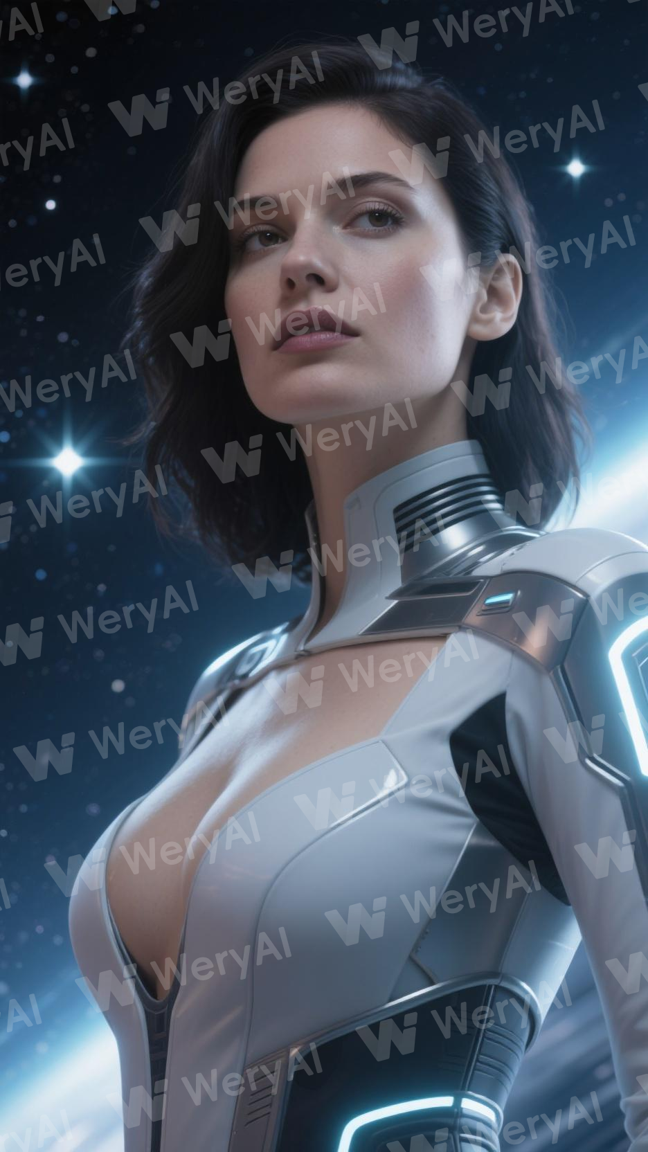 Half-bust portrait of a stunning adult woman. Beautiful face, dark hair, expressive eyes. Naturally curvy body with a full, elegant bust. Confident, captivating expression. Futuristic space-inspired outfit, tasteful and refined. Cosmic background with soft stars and glowing light. Cinematic lighting, ultra-realistic, elegant and powerful.
