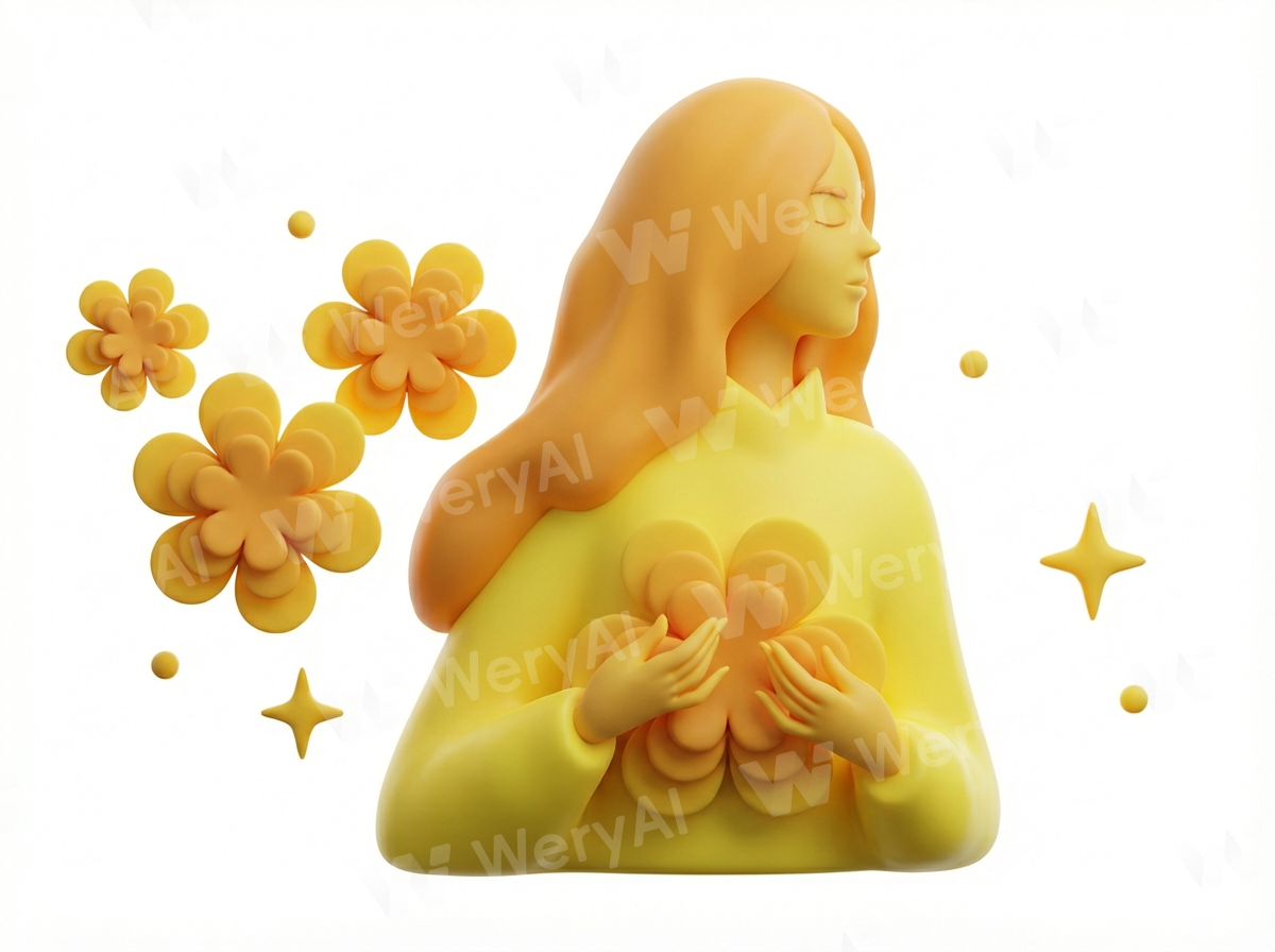 Please change the pattern in this image to a 3D rendering style for me, with a color palette predominantly in yellow (#F49C50). The material should exhibit a high-quality matte silicone or soft clay texture, with an extremely smooth and delicate surface free of any imperfections. Use soft studio-grade lighting with refined global illumination and ambient occlusion (AO), along with subtle rim lighting on the edges to enhance the sense of volume. The background should be a clean, pure white, and the overall image quality should be sharp and clear, similar to an 8K resolution 3D blind box collectible design.