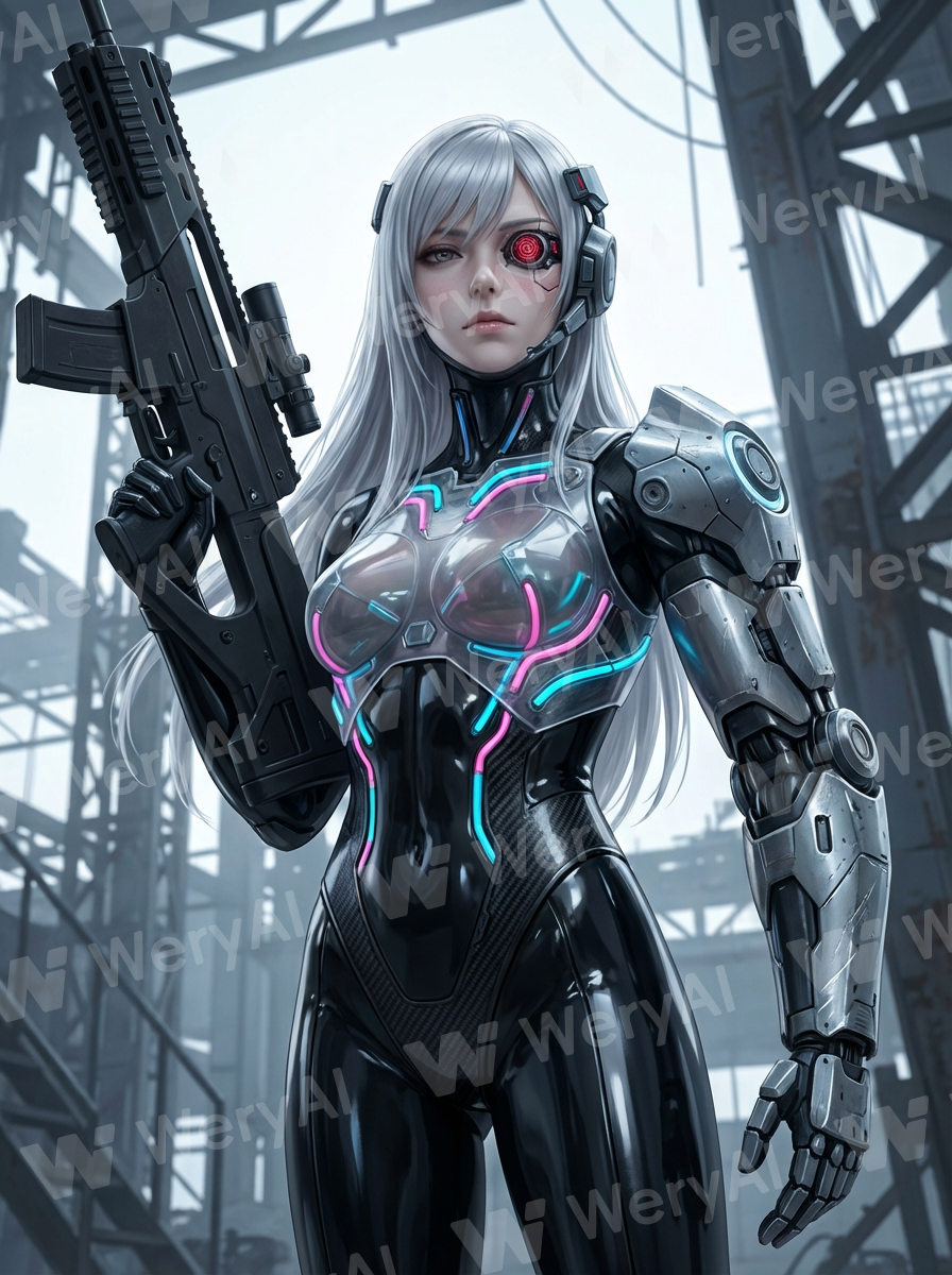 Subject: Cyber-anthropomorphic anime female, silver shoulder-length hair, cold and indifferent expression, a red spiral electronic prosthetic eye on the left, transparent skin texture with sub-surface scattering details. Voluptuous figure with full breasts and hips, creating high visual impact. 服饰: Wrapped in high-mobility tight-fitting mecha armor, spliced deep gray glossy latex and carbon fiber, translucent armor covering the chest, interwoven with cyan and pink fluorescent energy-conducting conduits. 装饰: Mechanical sensing components on the head, right hand gripping a heavy matte black electromagnetic rifle, left hand holding a giant composite reinforced exoskeleton, showing delicate metal scratches and cold highlights. 背景: Low-saturation industrial ruins, interlocking steel structure building clusters, high-key sky lighting, demonstrating strong spatial perspective and atmospheric depth. 风格: 85mm focal length freeze-frame, enhanced ambient occlusion and cold rim lighting, digital painting-level texture precision, cold-toned cyber-aesthetic rendering. Highlighting the subject.
