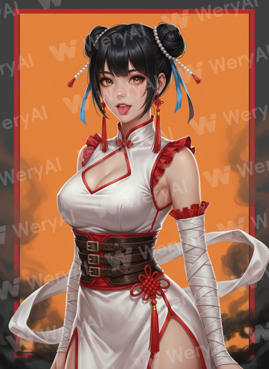 Clothing: A white tight-fitting modified qipao with red ruffled trim, layered leather-textured belts, and satin fabric featuring realistic light-responsive folds.