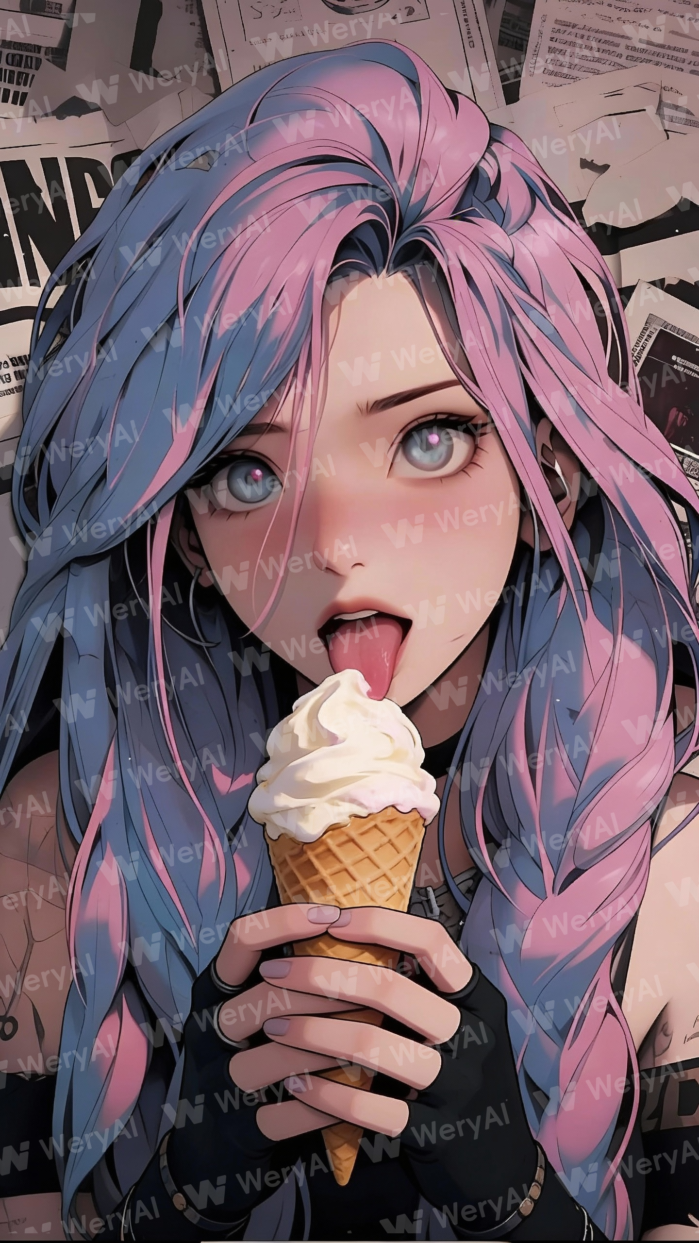 她双手捧着一个冰淇淋,伸出舌头舔