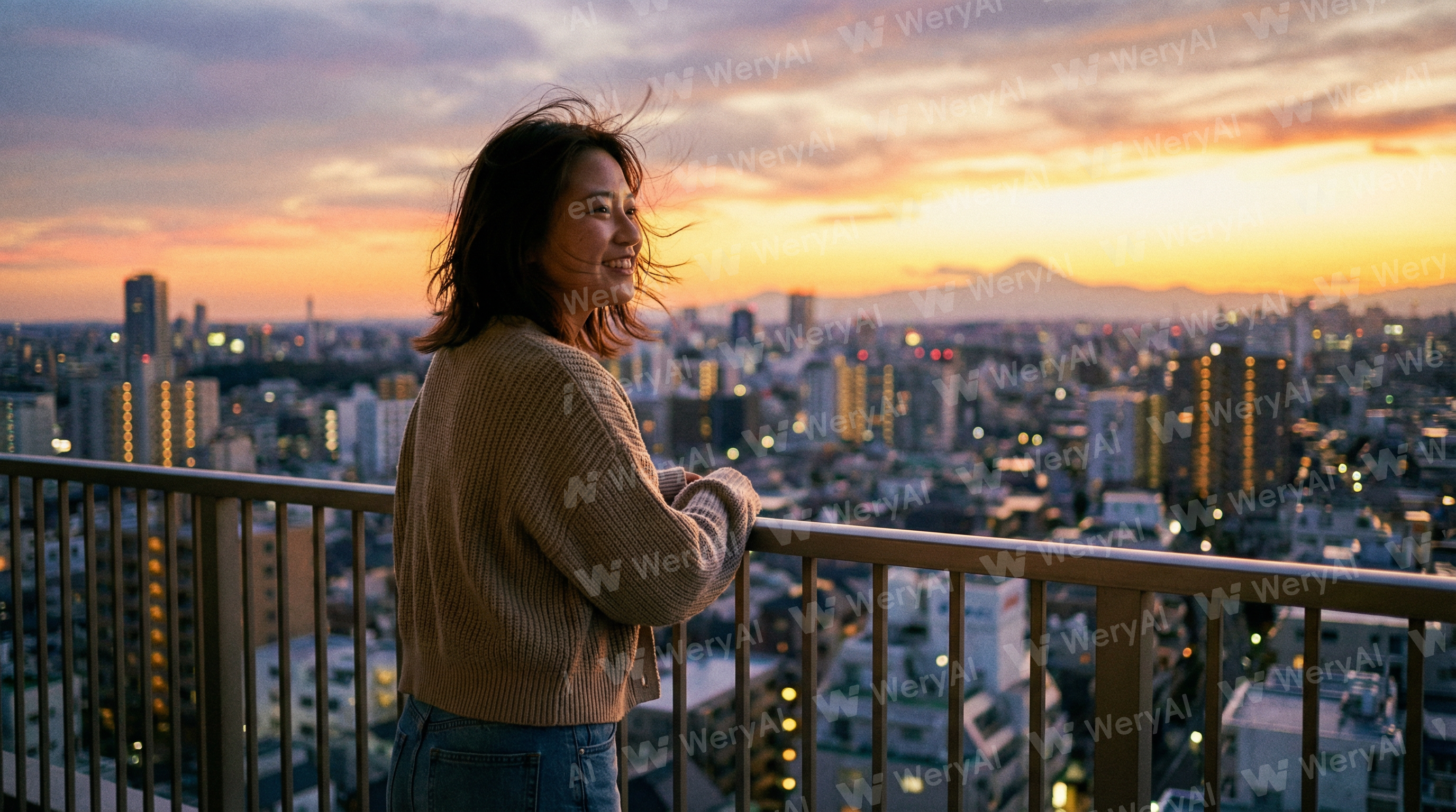 A beautiful 20-year-old Japanese woman standing on a balcony, with the Tokyo city sunset in the background. Realistic photography. Atmospheric.