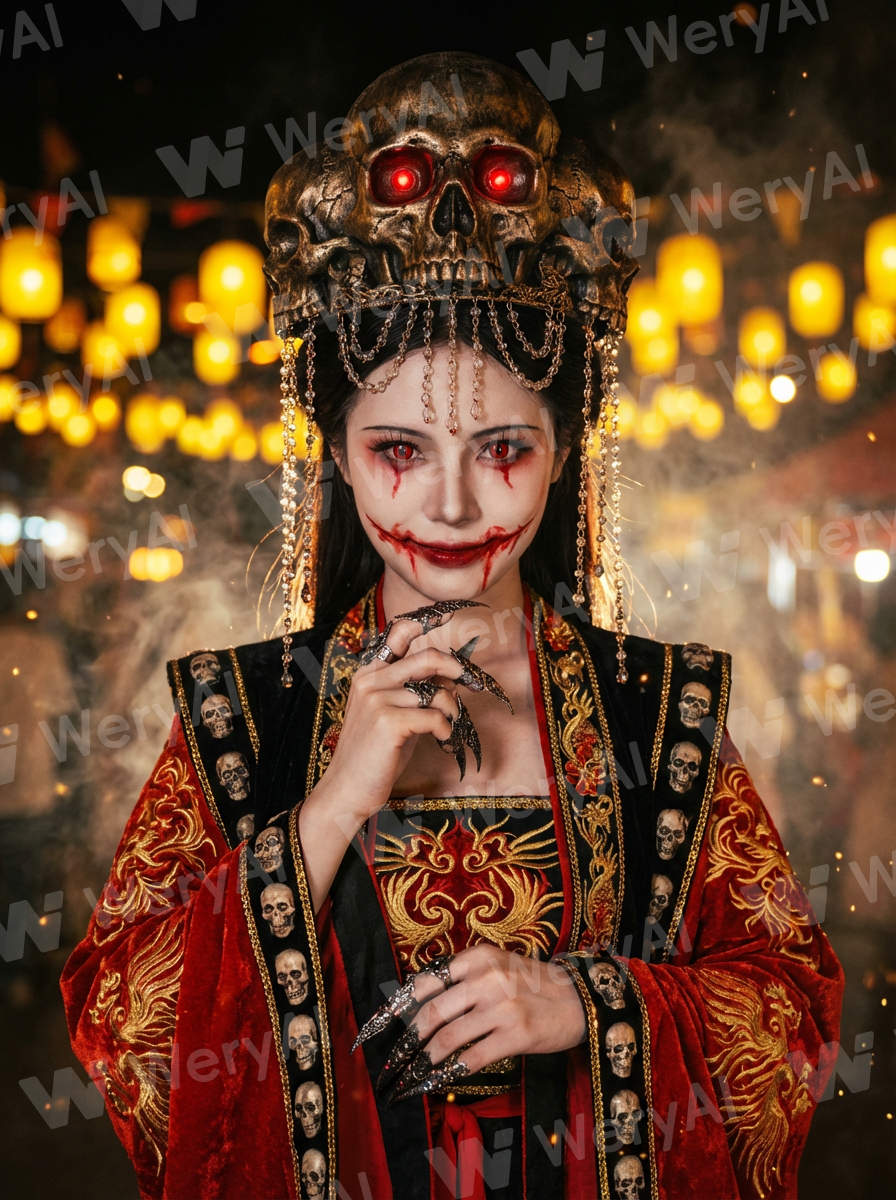 Ornaments: A massive bronze skull crown atop her head with red light emitting from its eyes, draped with glazed bead chains; sharp Gothic finger claws worn on her fingertips.