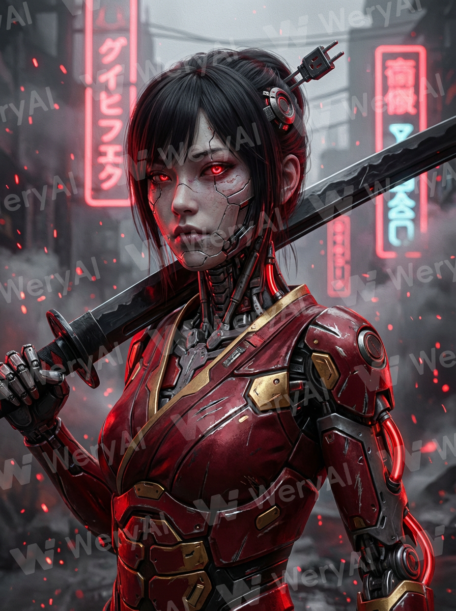 Subject: Cyber geisha girl, black hair and red eyes with a cold, aloof expression, exquisite bionic skin connected to precision mechanical skeletal structures. Attire: Deep red tech-kimono armor, gold and red composite materials covering the texture, with industrial scratches along the edges. Decorations: Power-socket mechanical hairpins, carrying a pitch-black alloy katana over her shoulder, red glowing tubes embedded in the joint components. Background: Smoke-filled industrial wasteland, dotted with red particle sparks, giant glowing signs enhancing the depth of perspective. Style: 85mm close-up lens, red, black, and gray tri-tone palette, subsurface scattering, and an AI-generated thick-painted CG aesthetic.