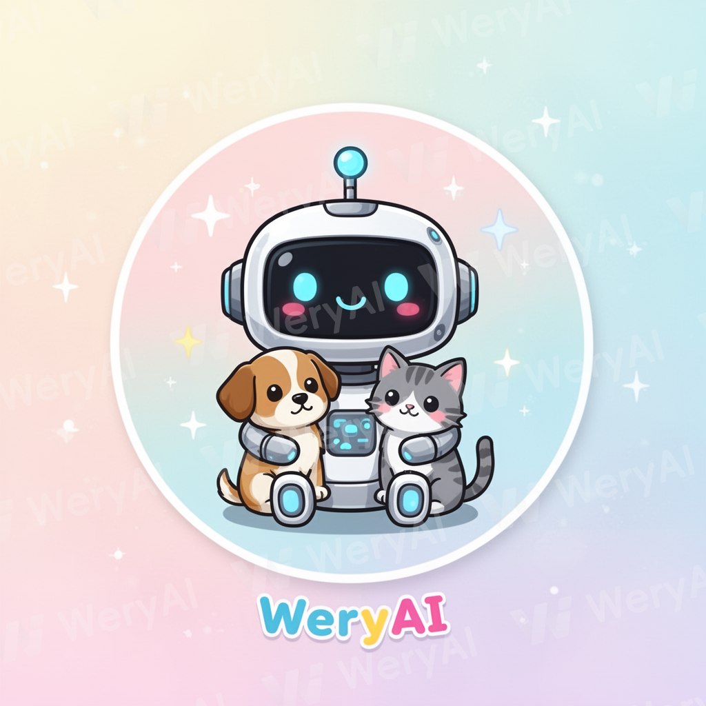 “A cute, round icon showing a tiny smiling AI robot holding a small puppy and a kitten. Colorful, soft pastel background with sparkles. Include small text (optional) ‘WeryAI’ in a playful font. Style: kawaii, cute, funny, adorable, minimal and eye-catching for profile picture.”