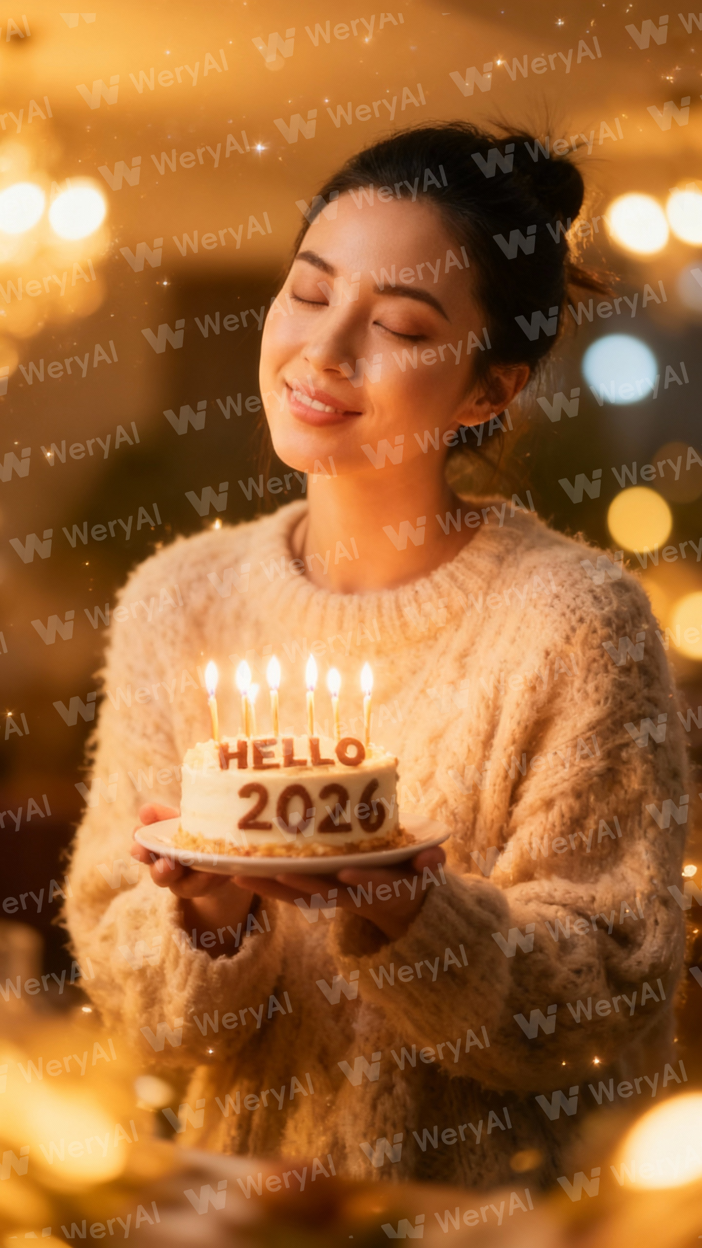 Using the character from the reference image, generate a heartwarming close-up portrait with a cake. A beautiful person with eyes closed and a sweet smile, making a wish on New Year's Day 2026. She is holding a cake in her hands. The cake says "HELLO 2026". Candles are inserted, with flickering flames. The lighting is warm, golden, and magical. Wearing a cozy, fluffy knit sweater. The background is soft bokeh lights. Pure happiness, dreamy atmosphere, high quality.