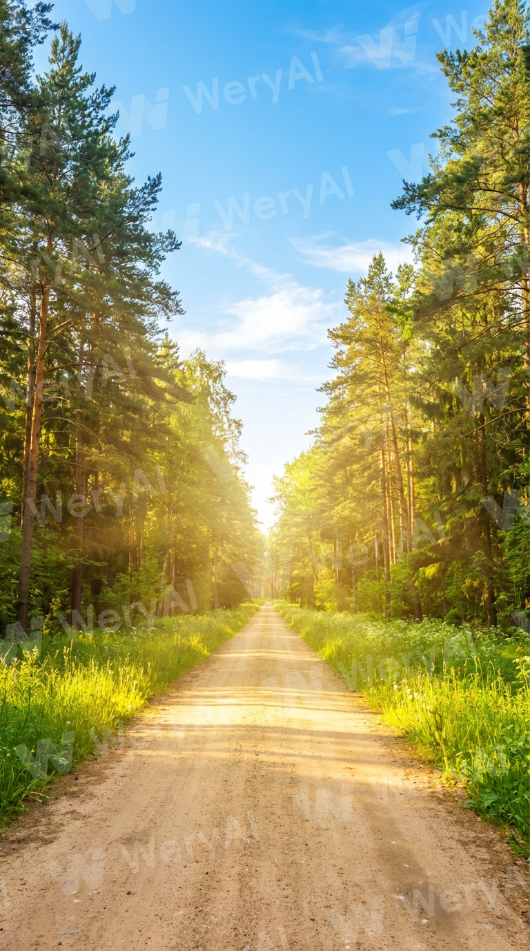 An open forest path extends infinitely into the distance The morning sun shines through the gaps in the trees Golden light covers the road surface Lush trees line both sides of the road Tender green grass and nameless wildflowers grow by the roadside The distant sky is clear and azure A few wisps of light white clouds float by The road is clean and tidy No figures appear The overall image is simple and grand Bright and warm tones Full of hope and the power to move forward Suitable for a daily wallpaper High definition Balanced composition