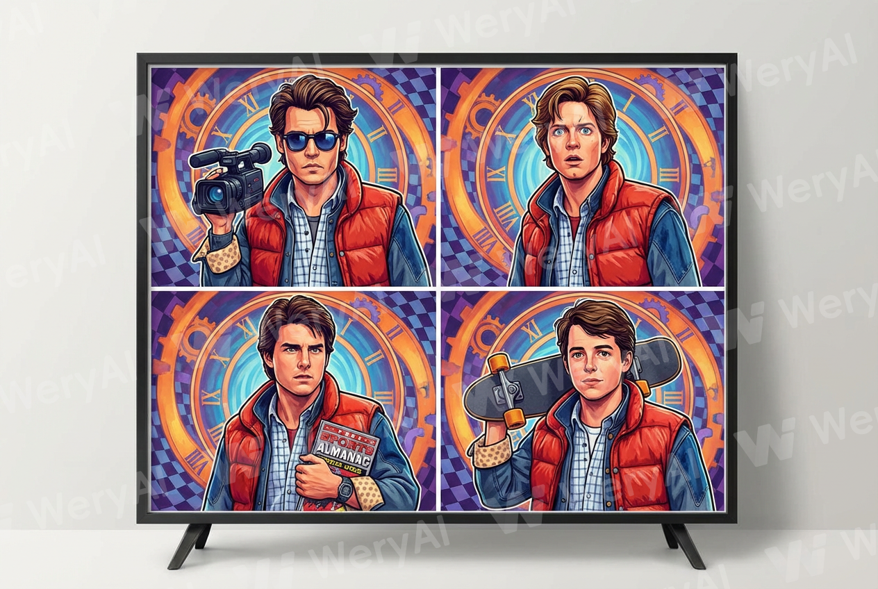 A vibrant illustration for a Back to the Future themed quiz question. No text. Johnny Depp, Eric Stoltz, Tom Cruise and Matthew Broderick as Marty McFly, dressed as Marty Mcfly