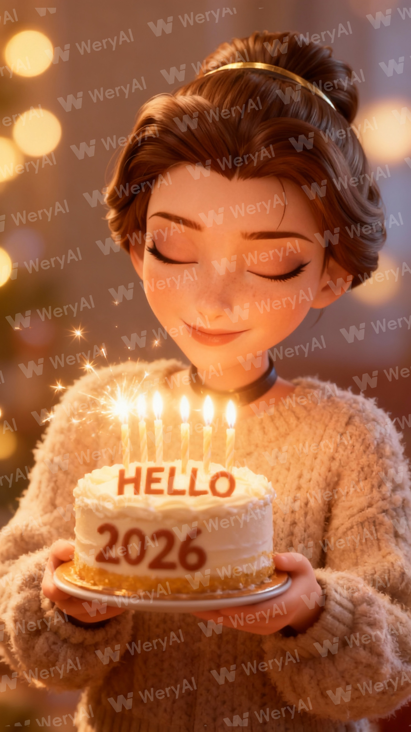 Using the character from the reference image, generate a close-up, heartwarming portrait with a cake. A beautiful person with eyes closed and a sweet smile, making a wish on New Year's Day 2026. She is holding a cake in her hands. The cake says "HELLO 2026". It is decorated with candles, with flickering light. The lighting is warm, golden, and magical. Wearing a cozy, fluffy knit sweater. The background is soft bokeh lights. Pure happiness, dreamy atmosphere, high quality.