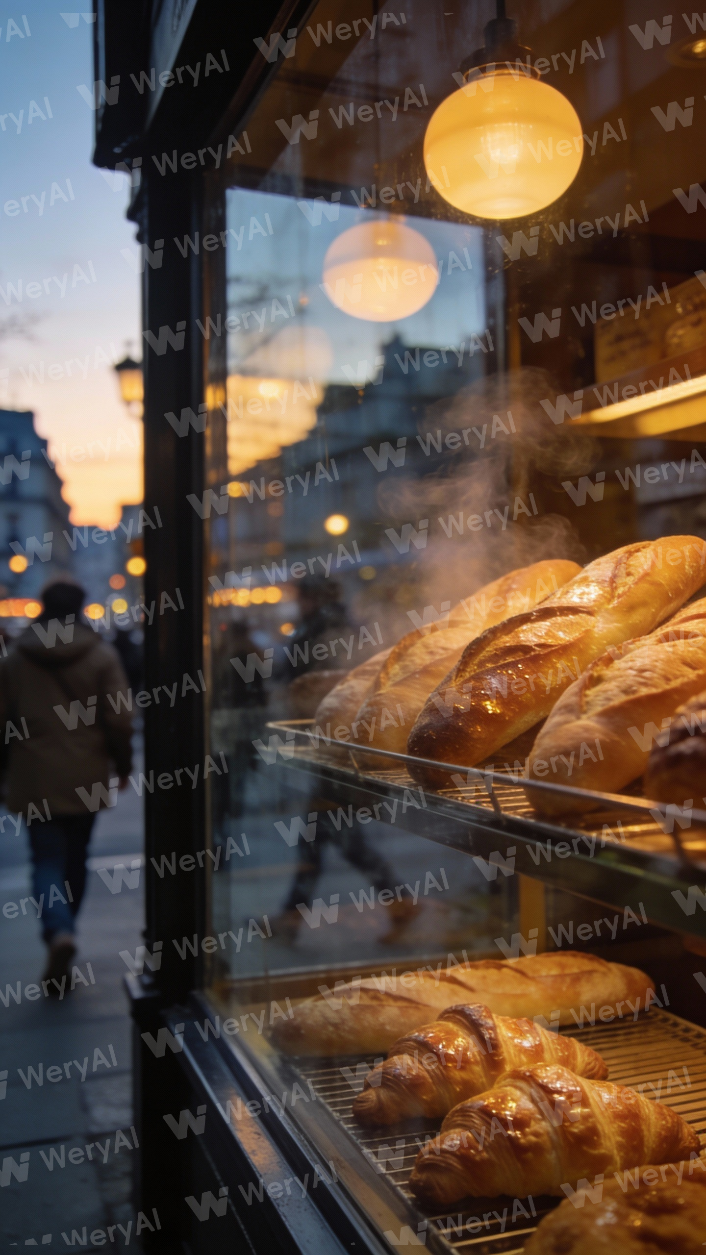 At dusk, warm light glows from the display window of the corner bakery, and the aroma of freshly baked bread wafts through the air. Pedestrians hurry past as the city lights begin to flicker on.