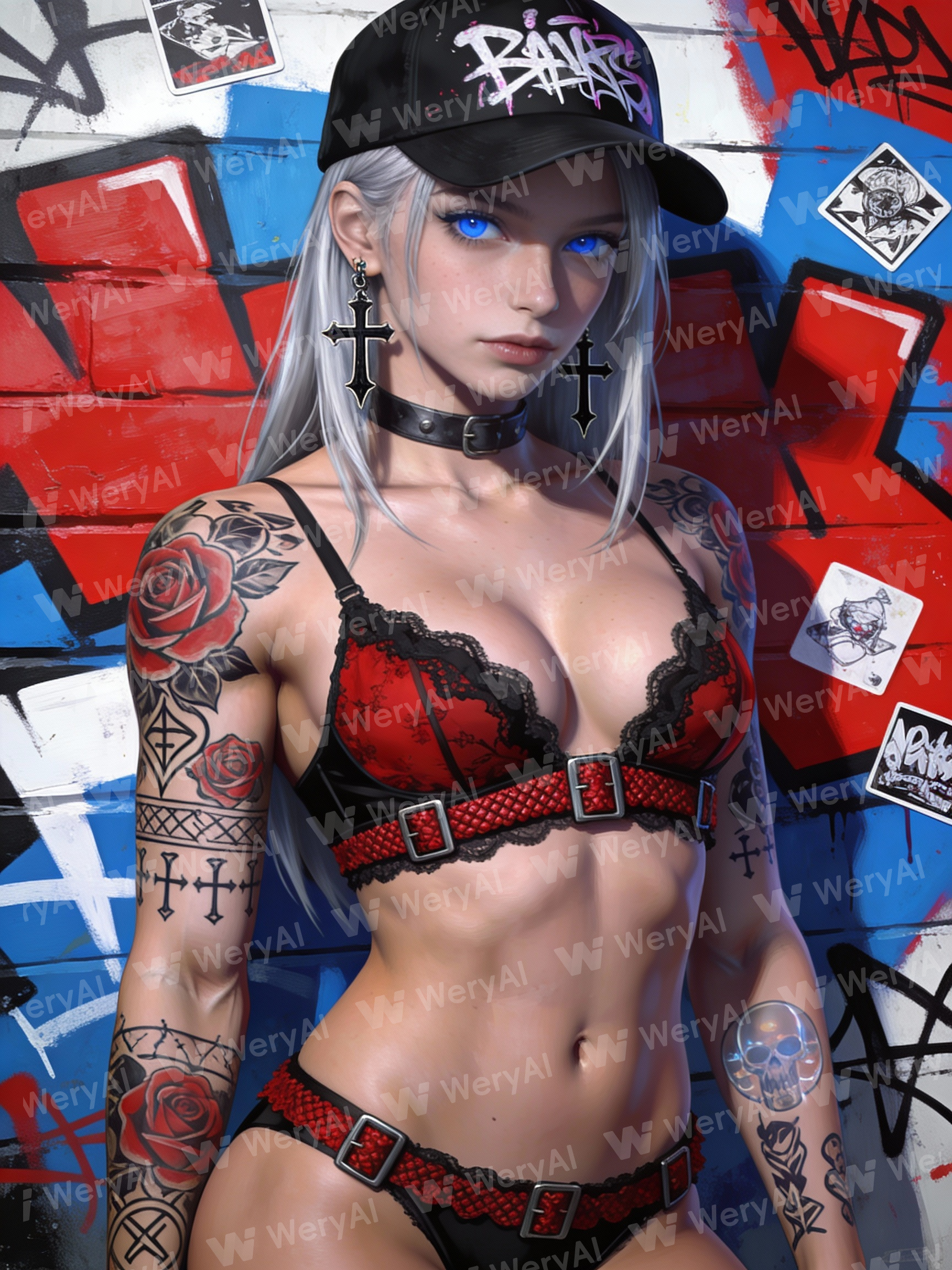 Subject: A silver-haired, blue-eyed young woman with a confident and cold expression. Her arms are covered in intricate rose and rune tattoos, with natural muscle tension. She has a hot physique with full breasts and hips, creating a powerful visual impact. Clothing: A black hand-painted graffiti baseball cap, red and black contrast lace lingerie; the fabric texture is delicate, with textured buckles adorning the edges. Decorations: Gothic cross pendant earrings, a leather choker; the arm tattoos have clear ink, showcasing rebellious street elements. Background: A maximalist Pop Art style graffiti wall, with stacked high-saturation red, blue, and white stickers; spatial depth is constructed by intersecting flat color blocks. Style: 2.5D impasto art, High Dynamic Range (HDR) imaging, ambient occlusion, strong outline depiction, and high-saturation color science.