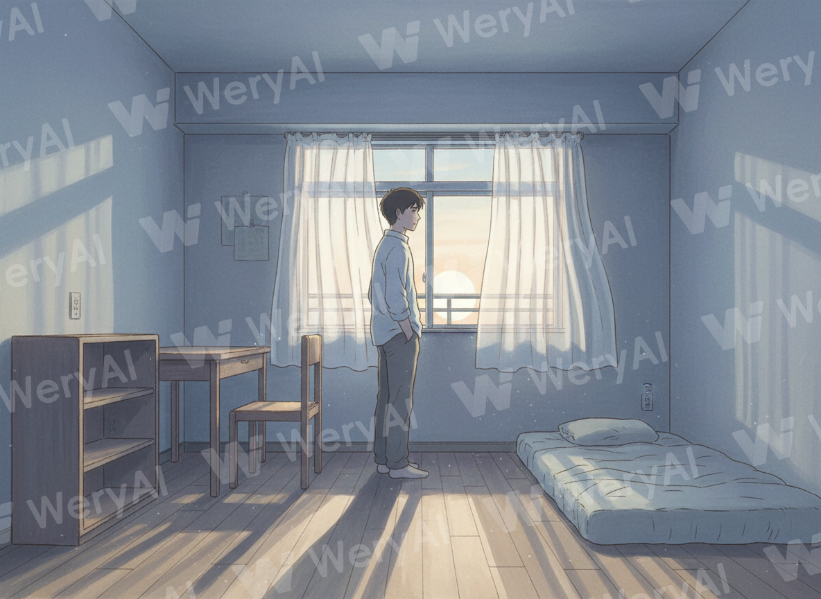 Studio Ghibli inspired illustration, early dawn light entering a small poor apartment room, a lone young man standing by the window, simple furniture, empty room, thin curtains moving slightly, blue morning light, quiet and reflective mood, realistic human proportions, subtle emotion, soft hand-painted anime style, calm cinematic framing