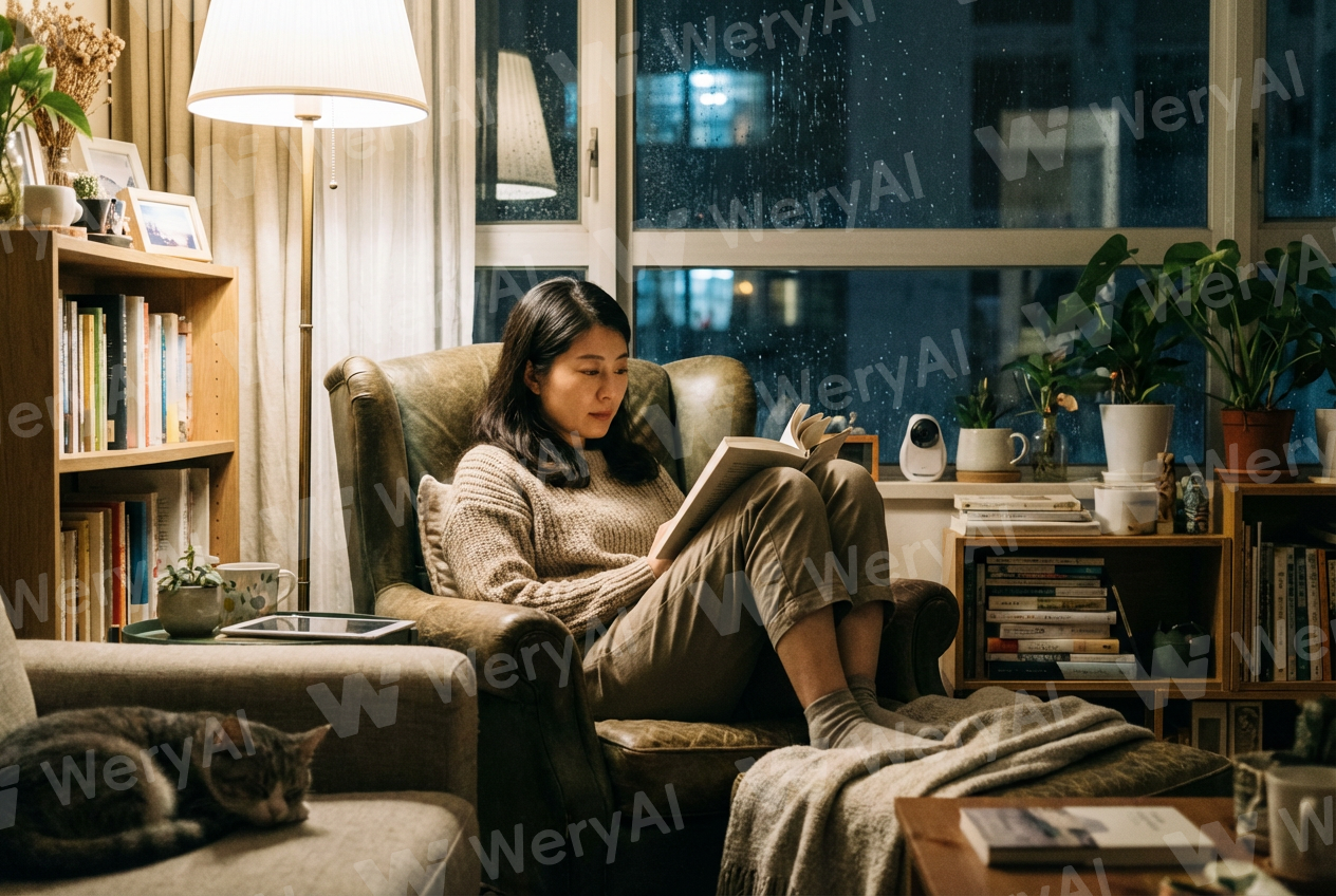 A woman in her thirties alone at home, reading a book at night (Asian, realistic style, no text, no Chinese or English characters)