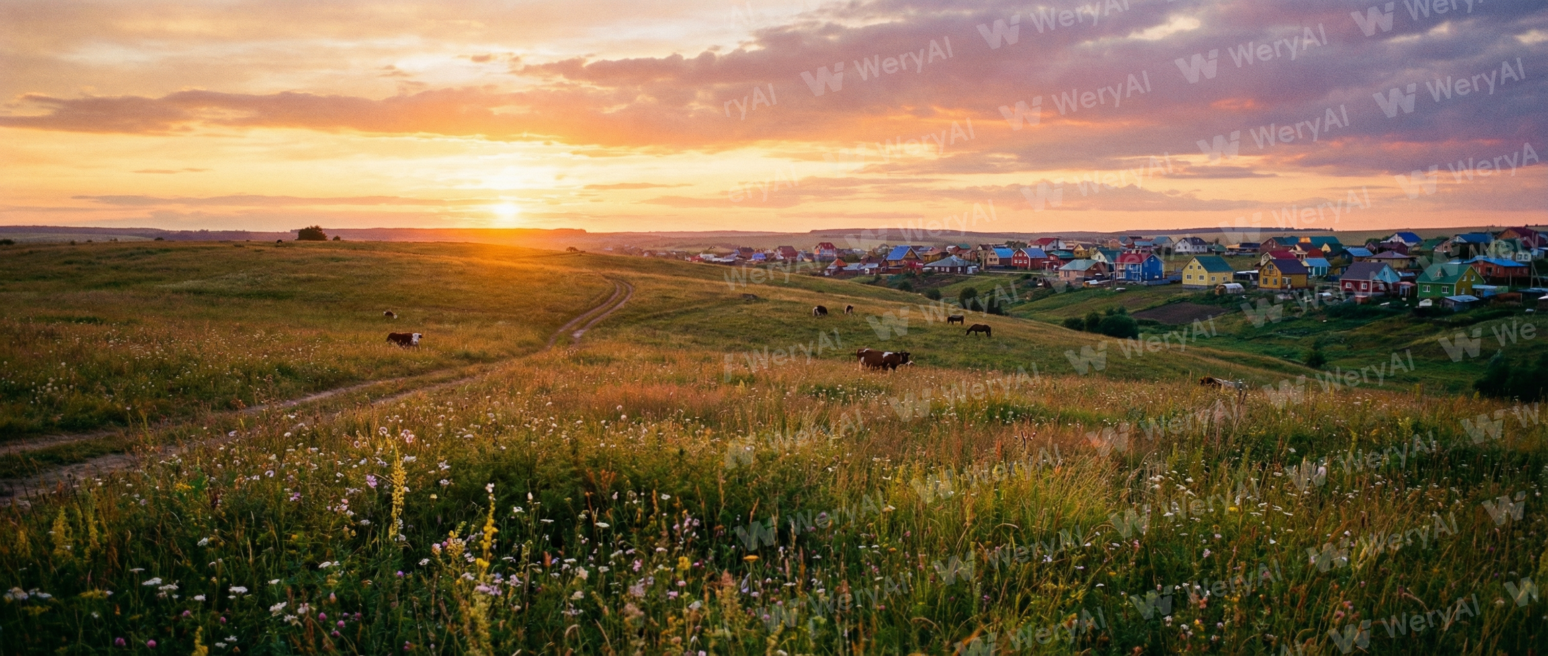 A grassland hillside under the sunset. In the distance are colorful houses.