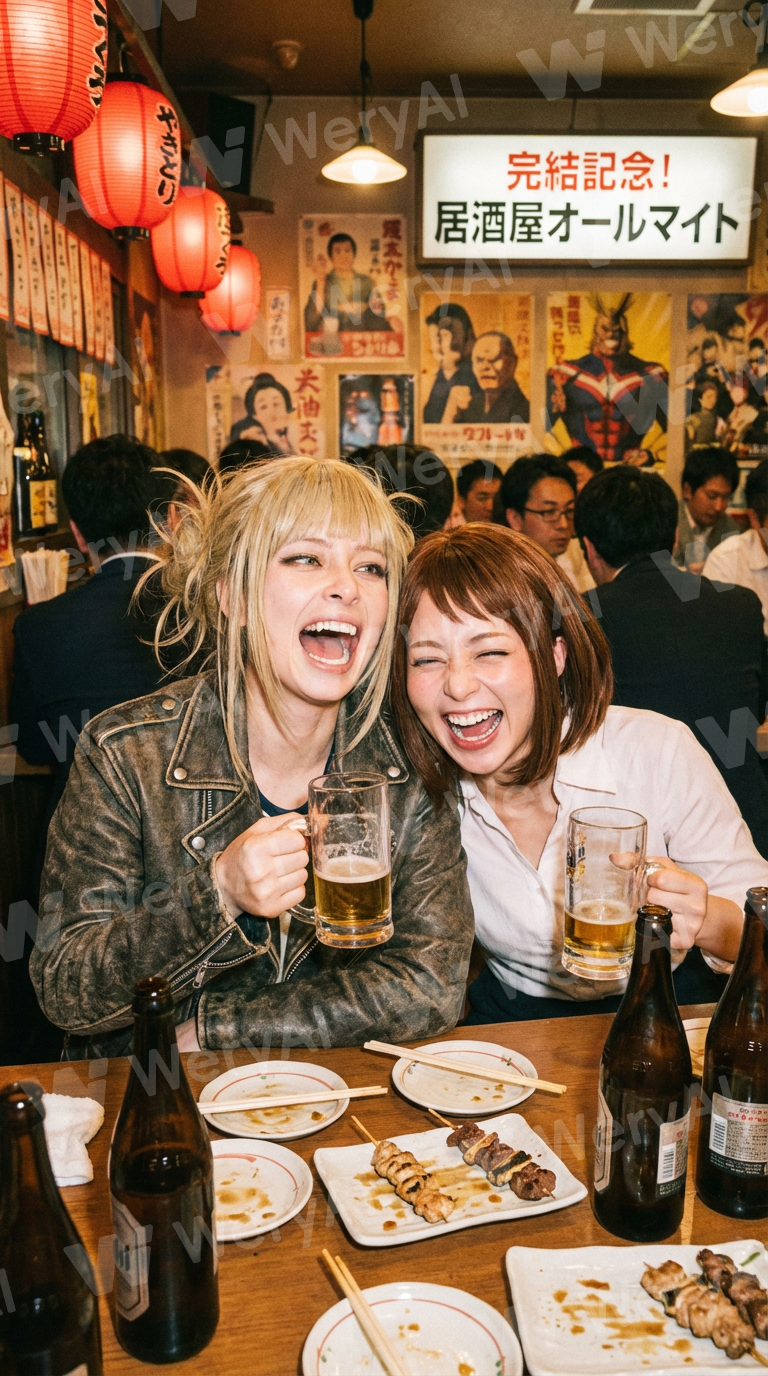 Create an original image of Himiko Toga from My Hero Academia. The concept is a scene where, assuming Toga-chan survived after the conclusion of My Hero Academia, she is happily drinking alcohol at an izakaya together with Ochaco Uraraka.