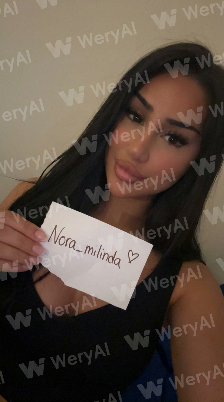 She should be holding a note that says Nora_milinda with a small heart on it. Please make it look like she wrote it herself.