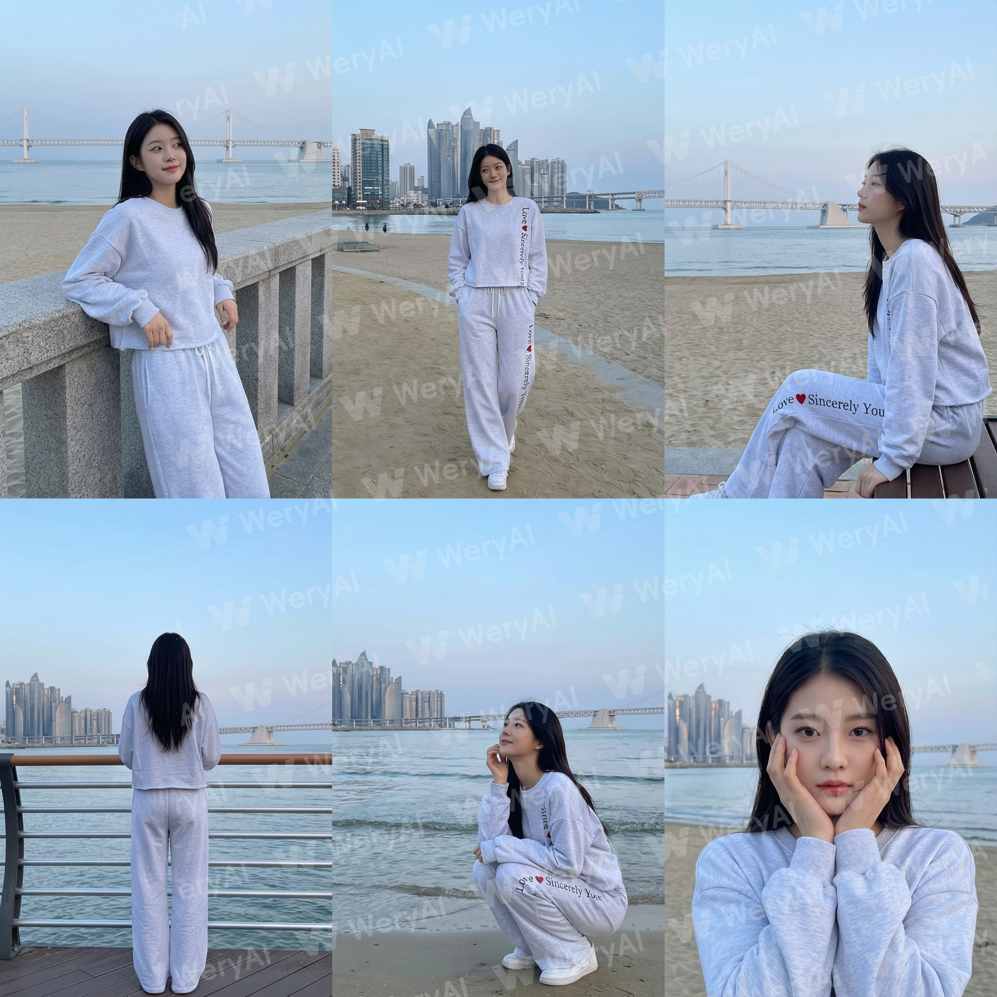 Dress a Korean female model in her 20s in the clothing from the attached photo. Do not tuck the top into the pants, and keep the total length of the garment exactly as shown in the photo. Create 6 photos of a model with the face from the 1st attached image, standing stylishly in the street shown in the 2nd attached image. Please represent the texture and lettering of the clothes as accurately as possible. Make the images look natural, like travel snapshots taken on an iPhone, but use poses and compositions suitable for a fashion magazine editorial. For the expressions, make them chic or subtly smiling rather than laughing. Use a 1:1 aspect ratio. Ensure all 6 photos feature the model in different spots within that same location with different poses. To clarify, I want you to generate 6 separate individual images. Please make the model occupy a larger portion of the frame.