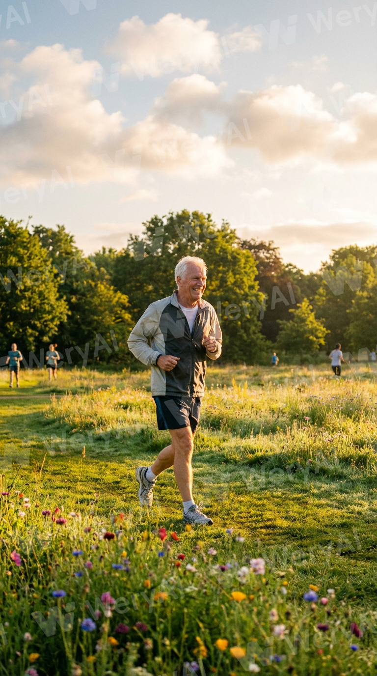 Early morning in an outdoor park. Soft morning sunlight bathes the earth. A gray-haired elderly man in comfortable sportswear is jogging, sweat drenching his forehead but with a smile on his face. Lush green trees in the distance, the lawn dotted with colorful little flowers, and a few white clouds floating in the sky. The overall scene is full of vitality and vigor. Realistic style, bright and warm tones, highlighting a positive and uplifting atmosphere. Rich in detail, high definition.