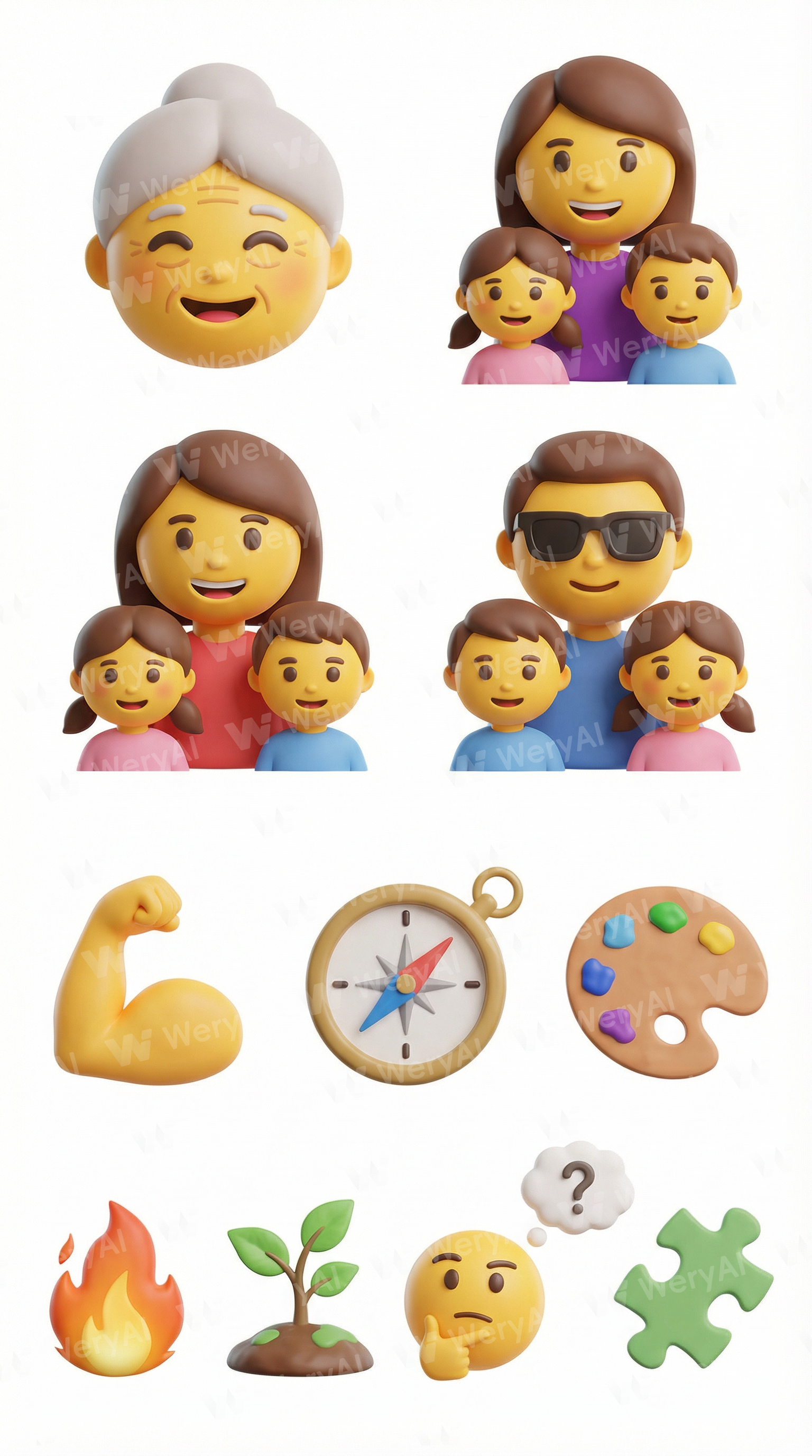 Based on the artistic style of the reference image, generate for me: a mother, a grandmother, a son and daughter standing in front of the mother, a son and daughter standing in front of the father, arm muscles, a compass, a palette, a flame, a growing sapling, reflection, and a puzzle. All of the above emojis in one image, on a pure white background.