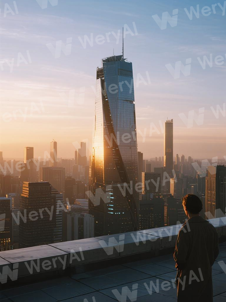 A realistic futuristic rooftop scene with a person overlooking a modern city skyline. Soft sunset light, reflective mood, cinematic wide shot.