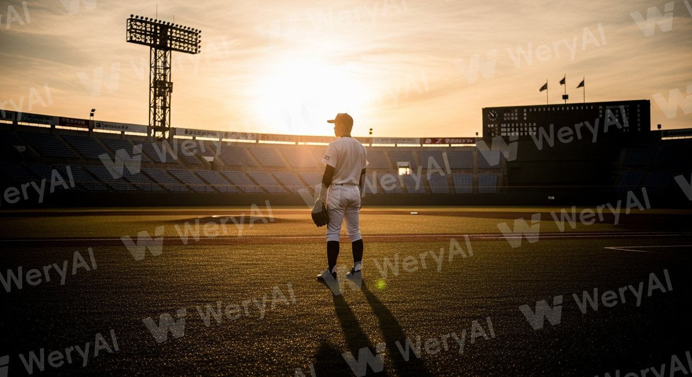 In the quiet evening, a Japanese baseball player stands alone on an empty baseball field; the afterglow of the setting sun stretches his shadow, and a sense of nostalgia fills the air.