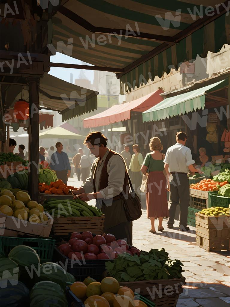 A photorealistic street market scene with people browsing fresh produce. Natural daylight, vibrant but realistic colors, candid human interactions, cinematic wide shot.
