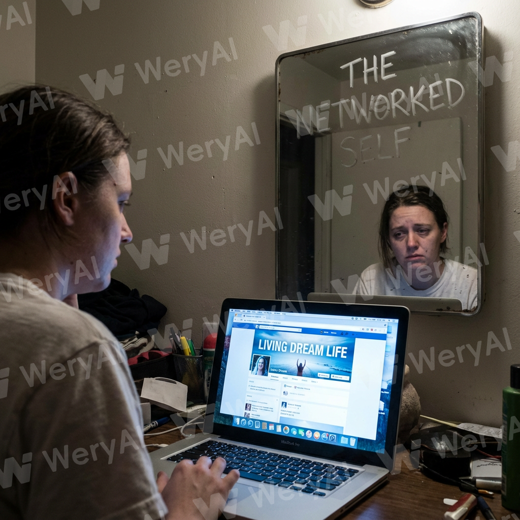 A person looking at their unrealistically perfect online profile, while their true desperation is reflected in a mirror opposite them—also known as the networked self.