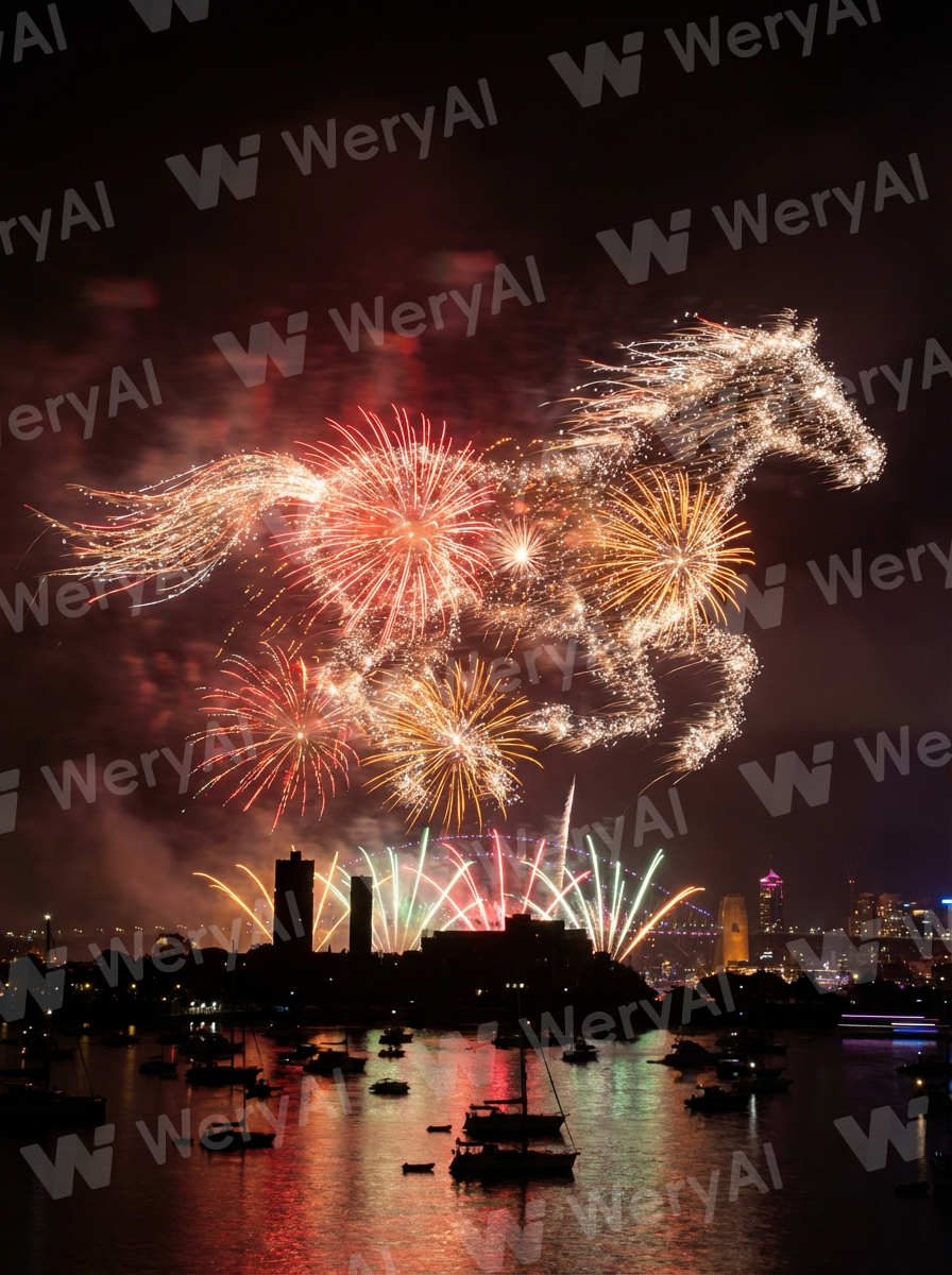 -- AR 3:4. Fireworks form the shape of A GALLOPING HORSE in the night sky above a waterfront city. The design is inspired by the colors, proportions, and silhouette of A GALLOPING HORSE, clearly readable and visually striking against the dark sky. Long-exposure, photorealistic fireworks photography with smoke trails, city skyline silhouette, and colorful reflections on the water. Cinematic composition, sharp detail, ultra-high-resolution 4K.